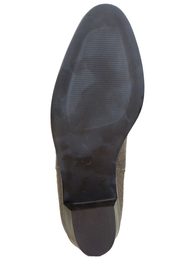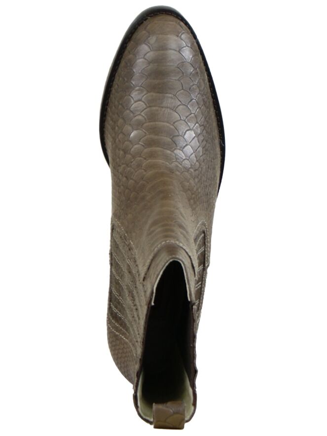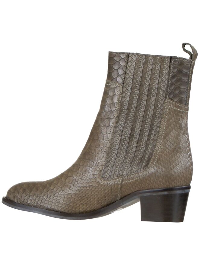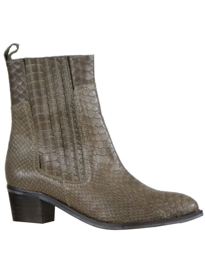 Een kort laarsje van het merk \" Kop en Staart\" in een reptiel print in de kleur zwart. De zijkanten van de schacht is met repen leder met daar achter een elastieken band erachter verwerkt. Het laarsje heeft een lederen binnenvoering en de zool heeft een pitrand.