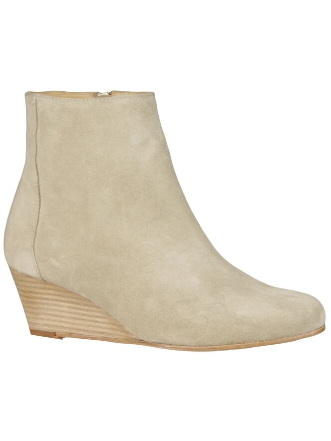 Een enkel laarsje op een sleehak van het merk \"Kop en Staart\" in een taupe kleur. Het laarsje heeft een ronde neus. Het laarsje heeft een lichtbruine zool.