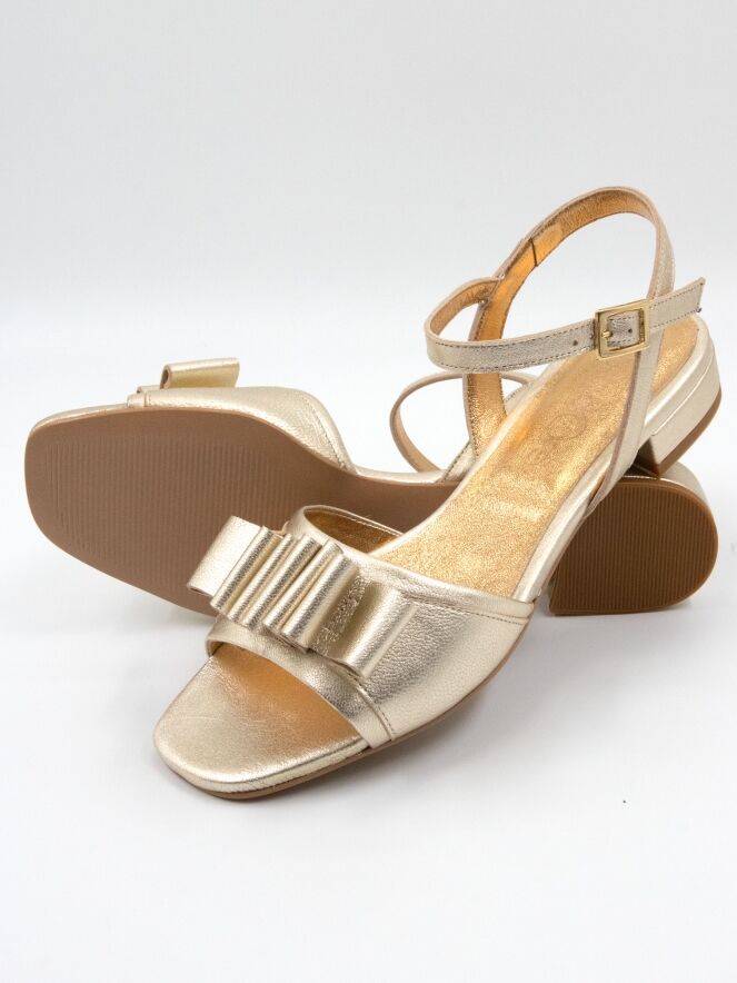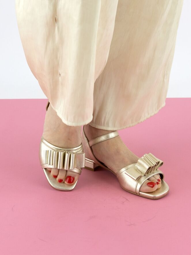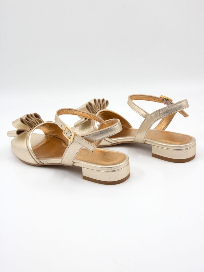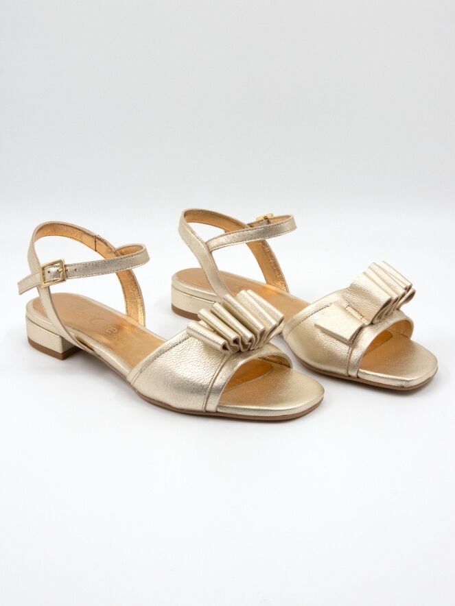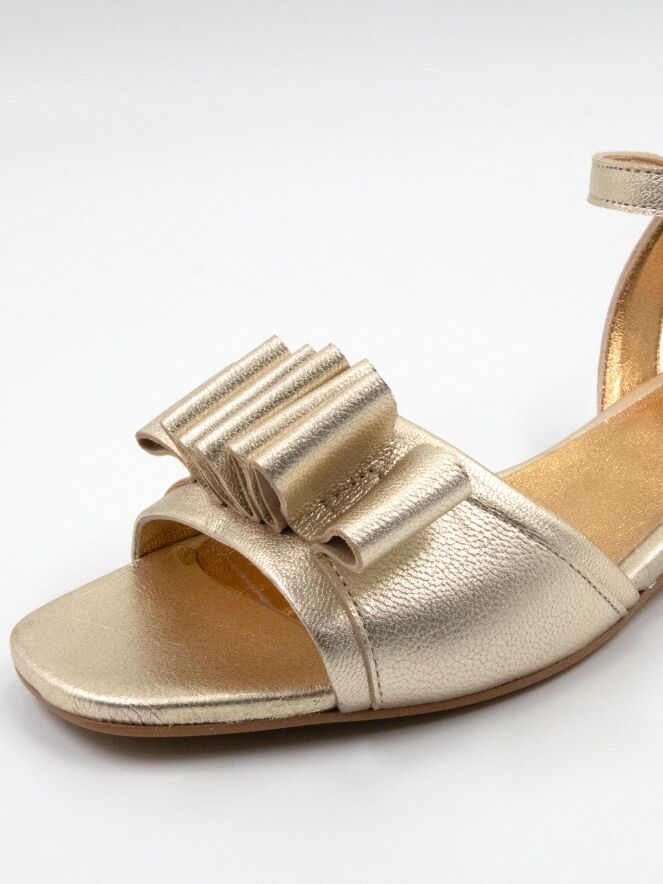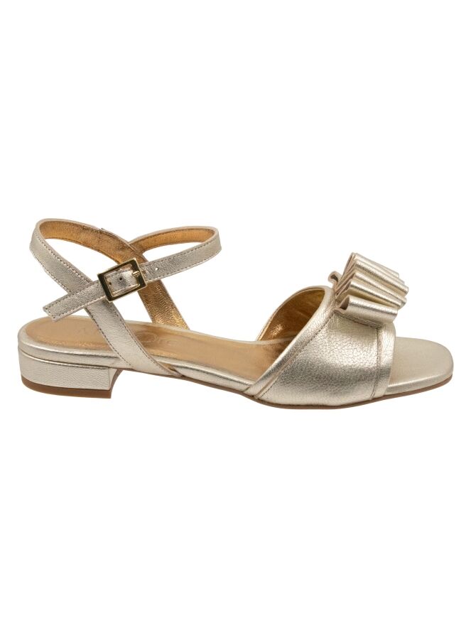 Een sandaal van Madore in de kleur platina. Op de voorvoet zit een decoratieve band van geplooid leder. Het hielbandje is verstelbaar aan de zijkant.