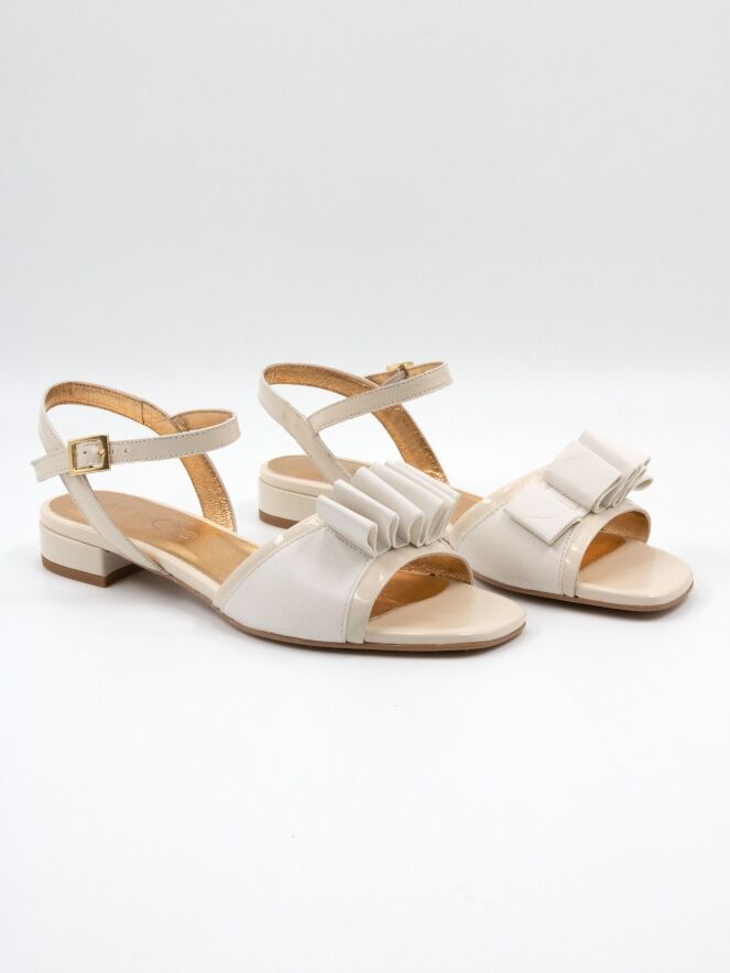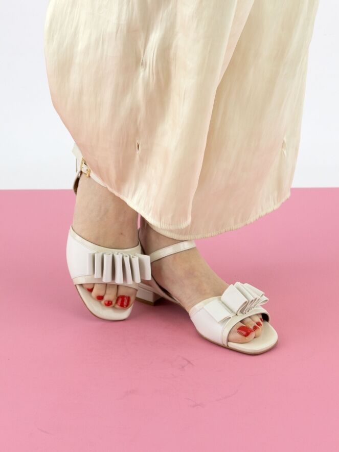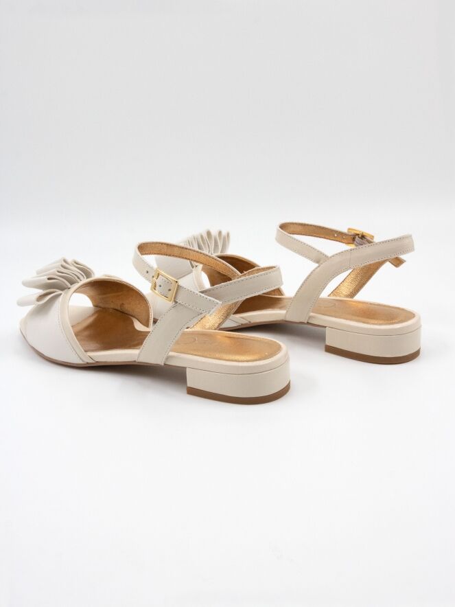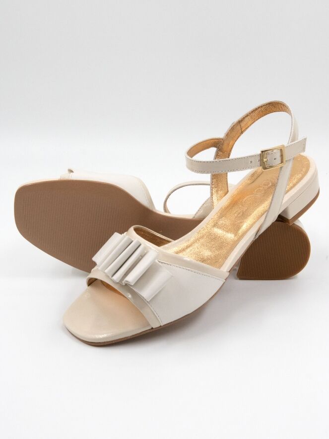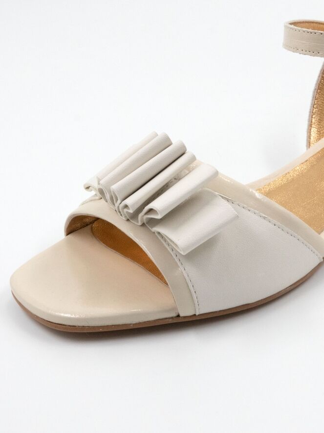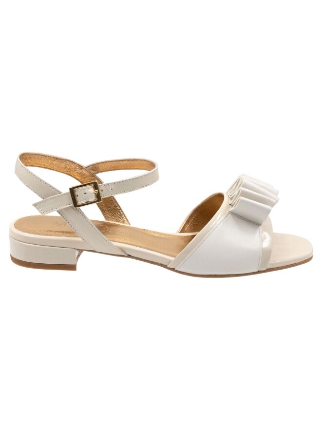 Een sandaal van Madore in een roomwitte kleur. Op de voorvoet bevindt zich een decoratieve band van geplooid leder. Het hielbandje is verstelbaar aan de zijkant.