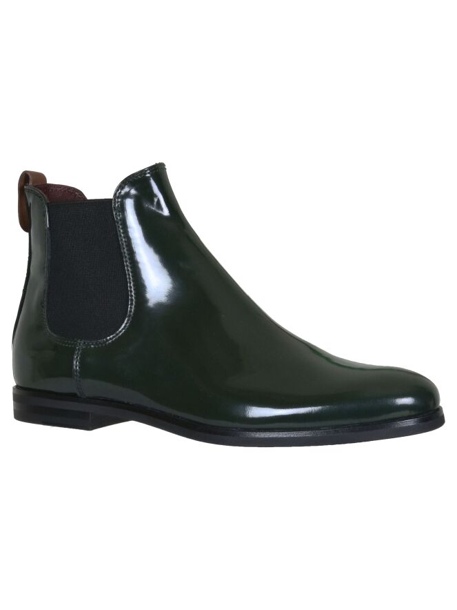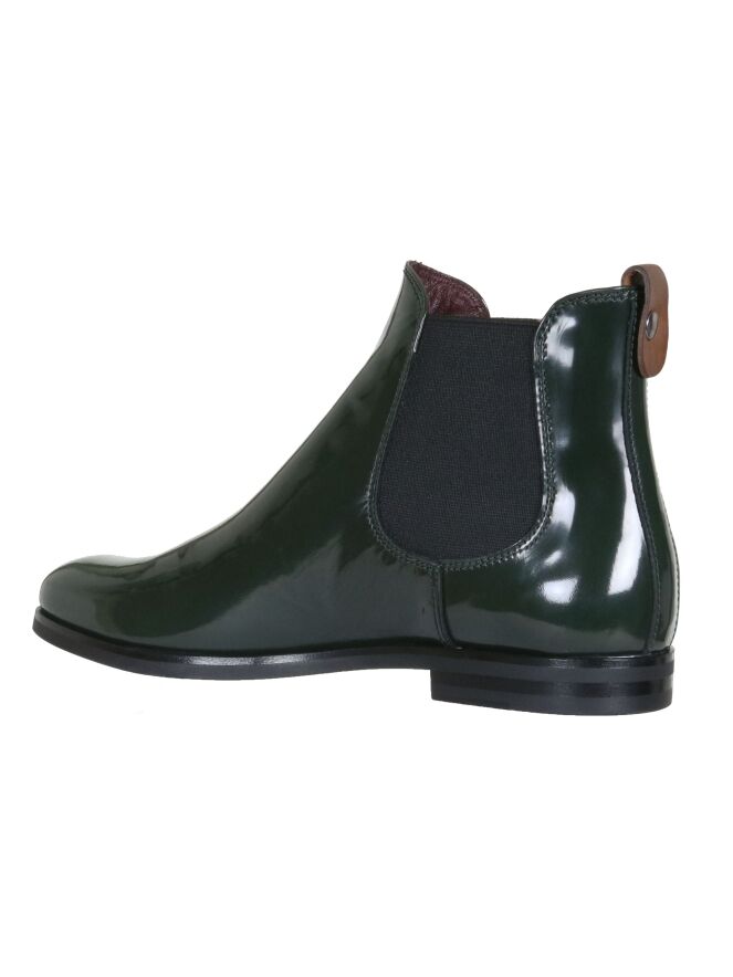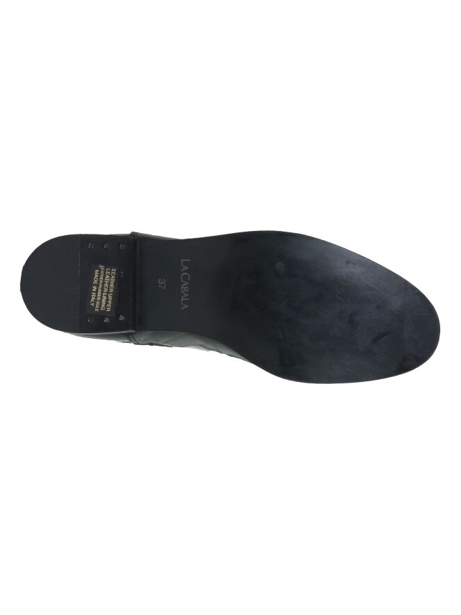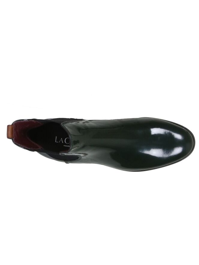 Een kort laarsje van La Cabala in de kleur donkergroen. Aan de bovenkant van de schacht is aan de achterkant een bruin lipje. Aan beide zijden van de schacht is een elastieken stuk stof. Het laarsje heeft een ronde neus en de binnenkant is met leder gevoerd.