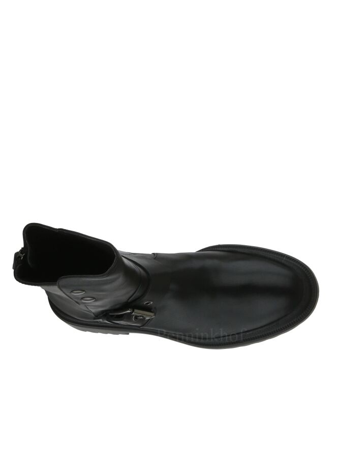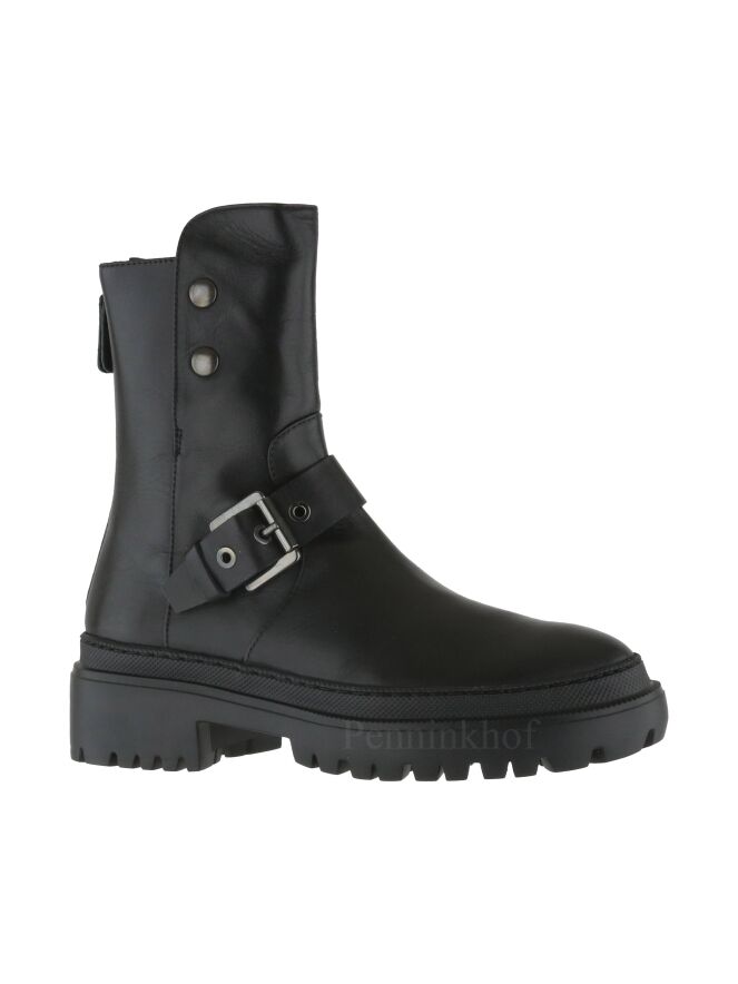 Een kort laarsje van La Cabala in de kleur zwart. Over de wreef is een decoratieve gesp. Aan de buitenzijde van de schacht zijn 2 drukknopen. vanaf de bovenzijde van de schacht tot achter op de hiel is een ritsje. De binnenkant van de schacht is met leder gevoerd.