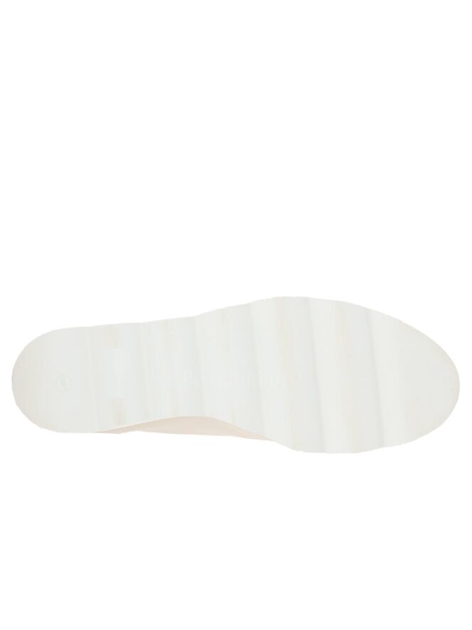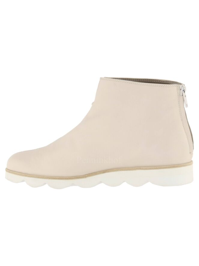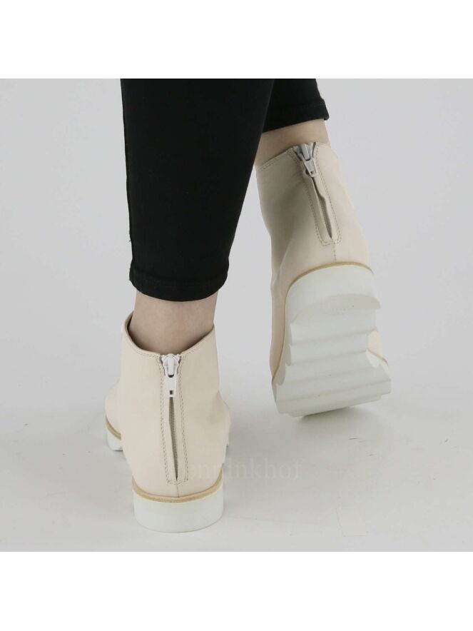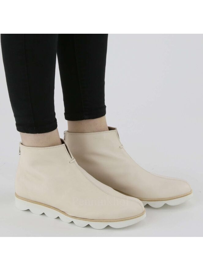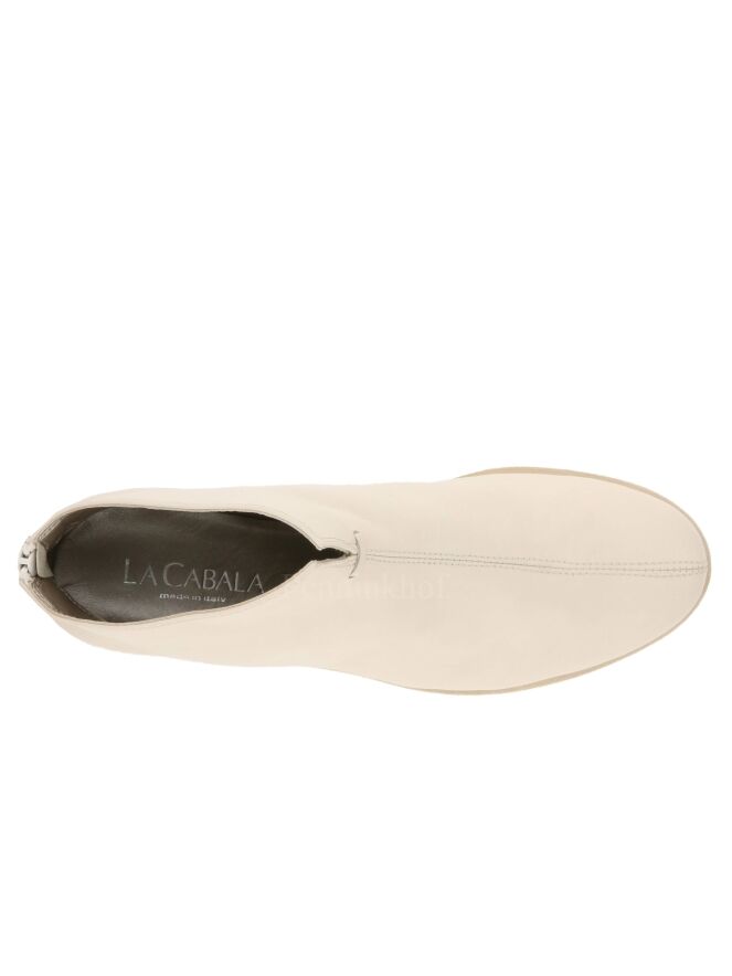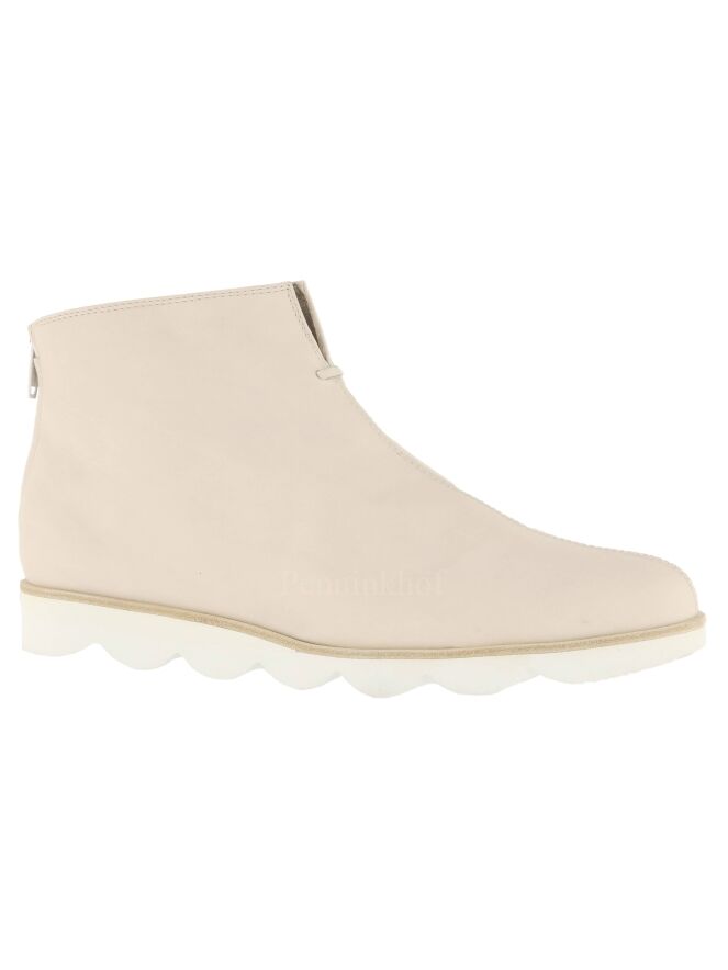 Een kort laarsje van La Cabala in een nude kleur. Het laarsje heeft een gekartelde witte zool. Op de hiel is een rits. De binnenkant is met leder gevoerd.