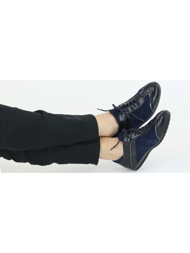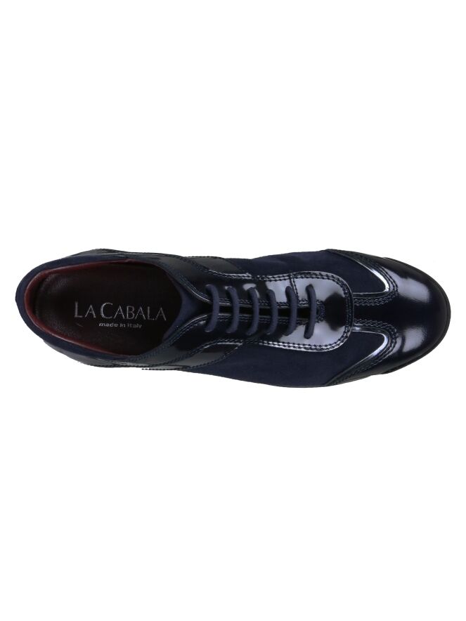 Een sneaker van La Cabala in de kleur marineblauw. Aan de zijkanten is een bies in marineblauw lakleder. De zijkanten , de tong en op de hiel is in een camoscio suède. De binnenzool is uitneembaar. De binnenkant is met leder gevoerd.