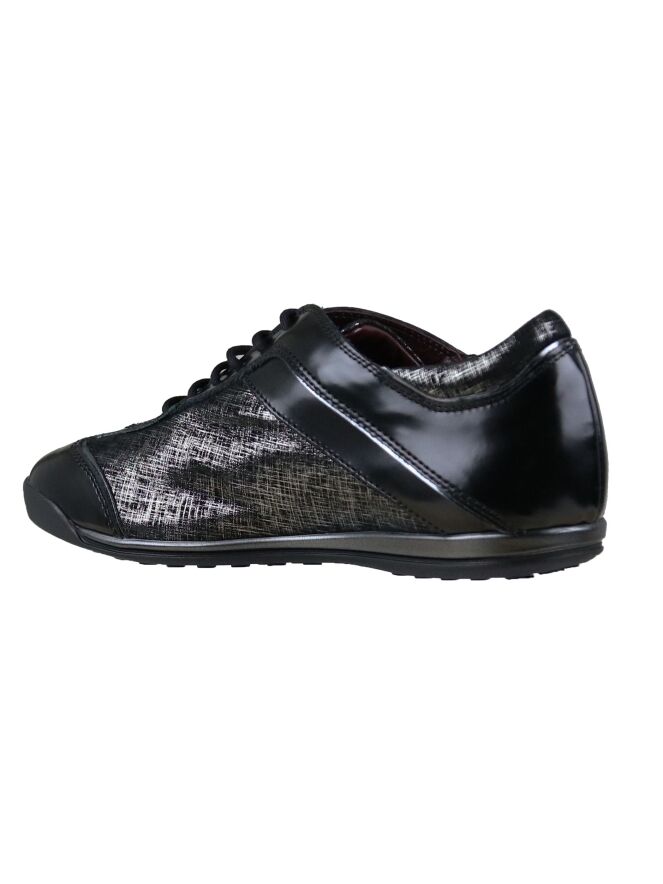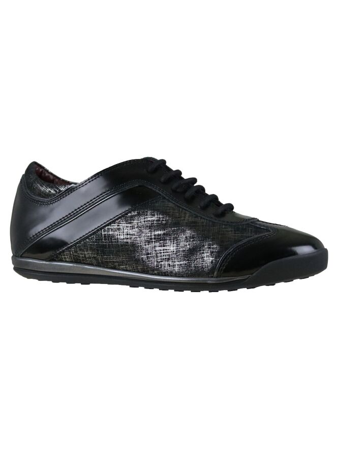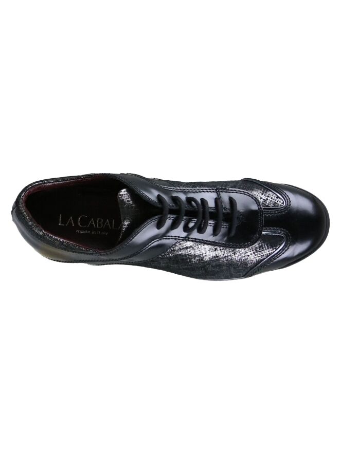 Een sneaker van La Cabala in de kleur zwart . Aan de zijkanten is een bies in een spazzolato leder. De zijkanten , de tong en op de hiel is leder in een grafische print met de kleuren zwart en zilver. De binnenzool is uitneembaar. De binnenkant is met leder gevoerd.