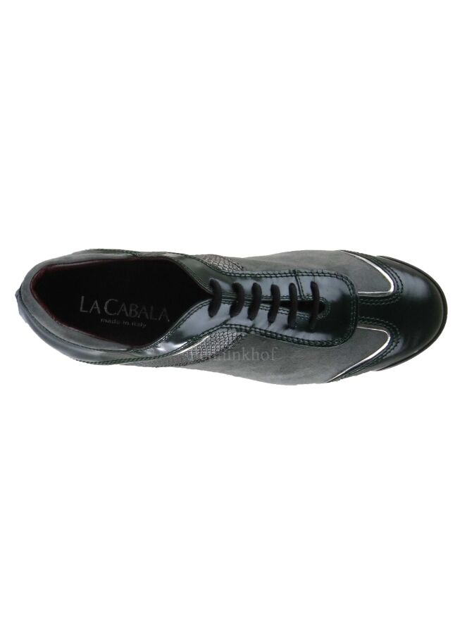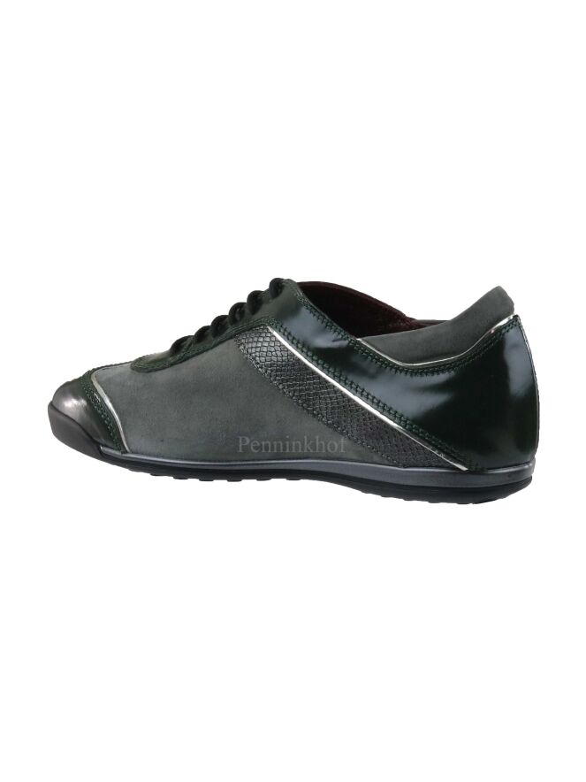 Een sneaker van La Cabala in de kleur donkergroen. Langs de schacht, op de hiel en op de neus is lakleder in een donkergroene kleur. Langs de zijkanten is een bies in een slangenprint in een brons kleur. De zijkanten zijn in de kleur grijs. De binnenzool is uitneembaar. De binnenkant is met leder gevoerd.