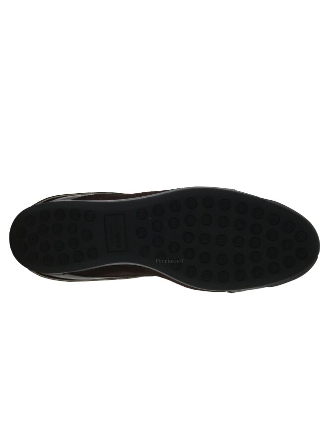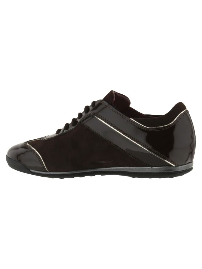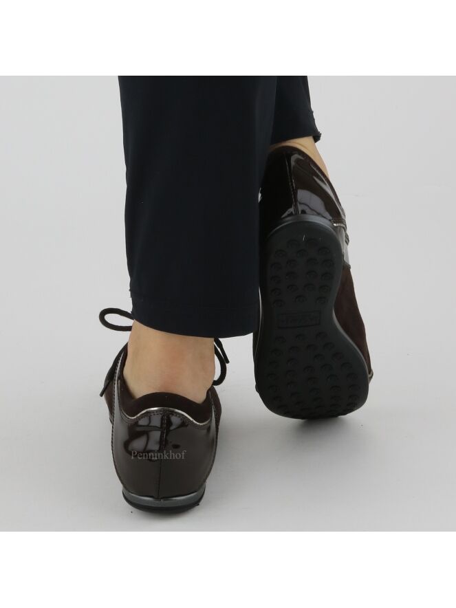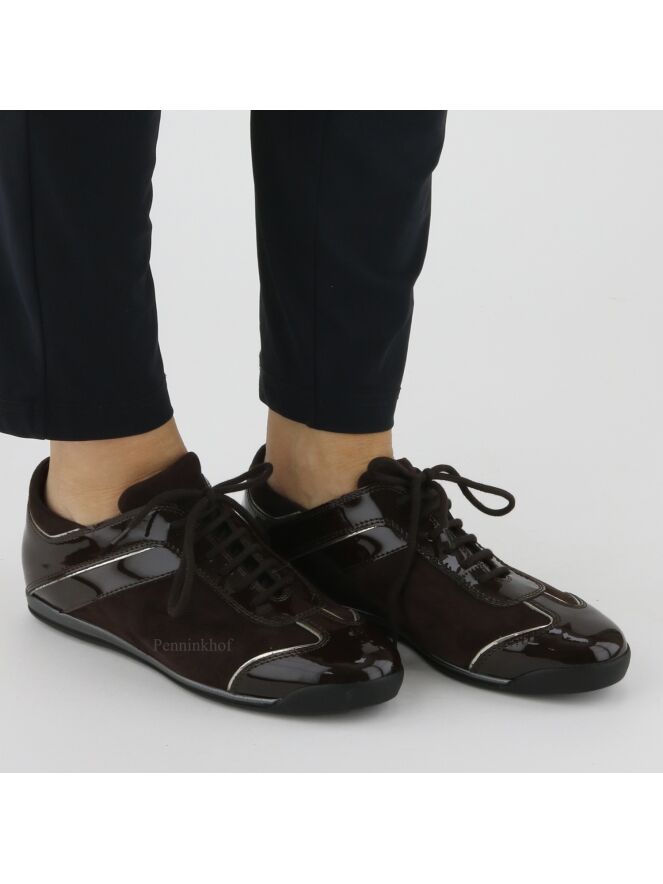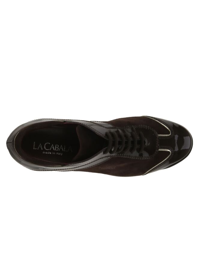 Een sneaker van La Cabala in de kleur mokkabruin. Aan de zijkanten is een dubbele bies in mokkabruin lakleder. De zijkanten , de tong en op de hiel is in een camoscio suède. De binnenzool is uitneembaar. De binnenkant is met leder gevoerd.