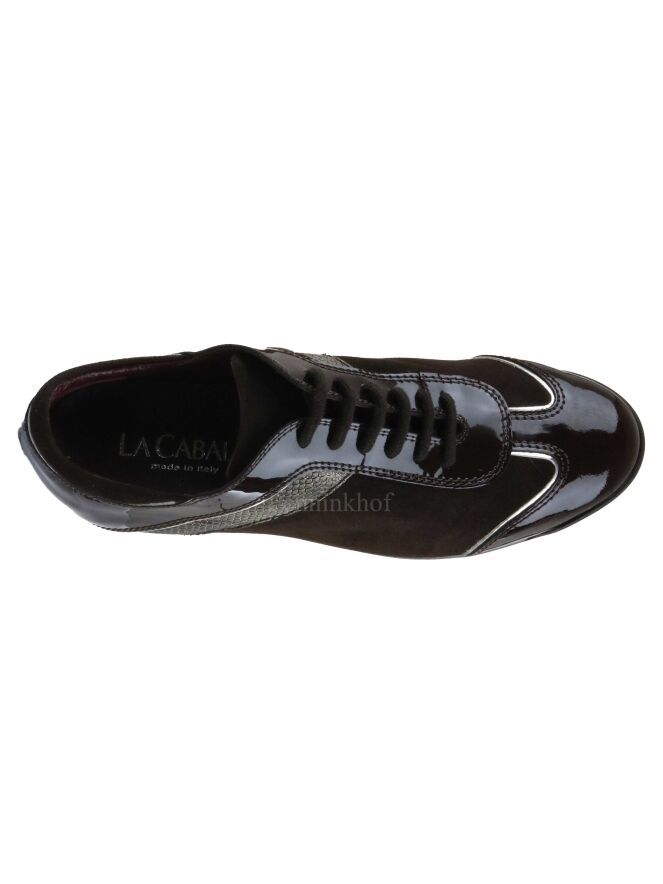 Een sneaker van La Cabala in de kleur mokkabruin. Langs de schacht, op de hiel en op de neus is lakleder in een mokkabruine kleur. Langs de zijkanten is een bies in een slangenprint in een brons kleur. De binnenzool is uitneembaar. De binnenkant is met leder gevoerd.