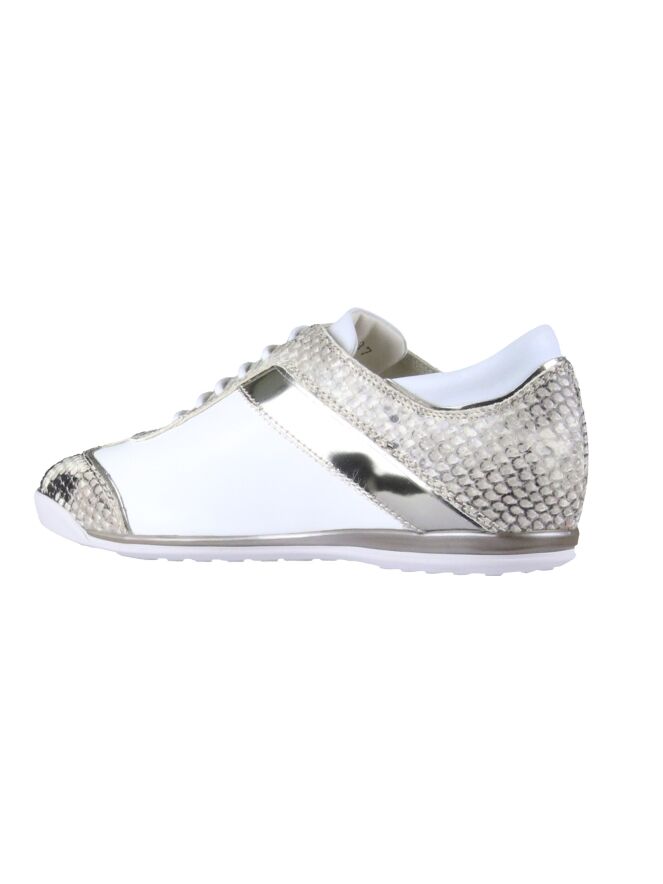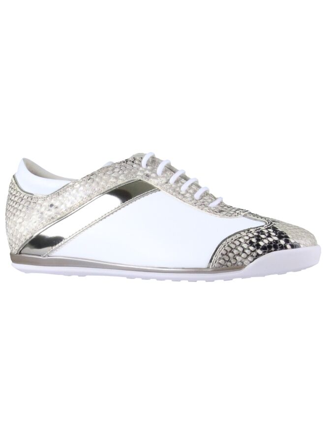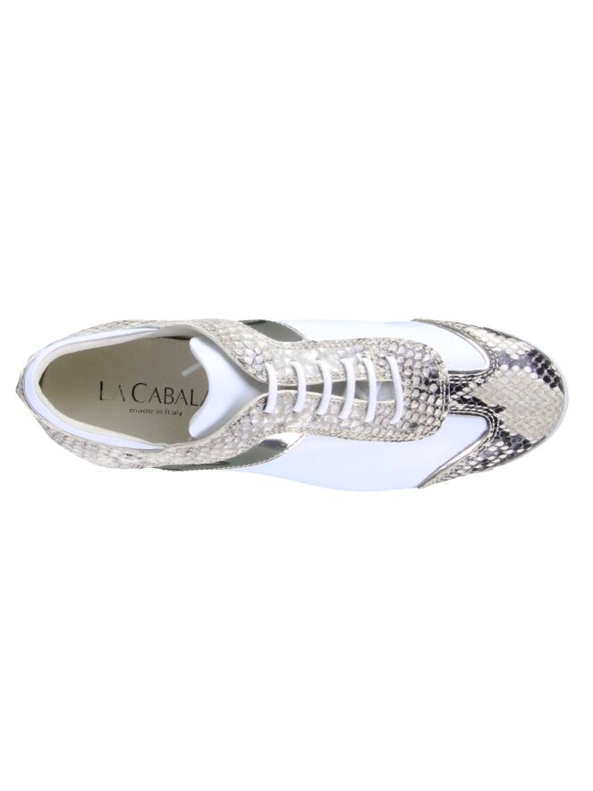 Een sneaker van La Cabala in de kleur wit. Langs de schacht, op de hiel en op de neus is een taupe kleurige pythonprint. Langs de zijkanten is een bies in een platina kleur. De binnenzool is uitneembaar. De binnenkant is met leder gevoerd.