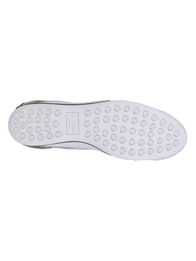 Een sneaker van La Cabala met de kleuren wit en groen. Aan de zijkanten is een zilveren bies. De binnenzool is uitneembaar. De binnenkant is met leder gevoerd.