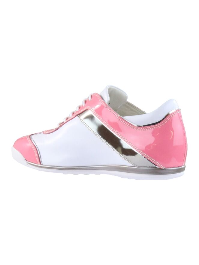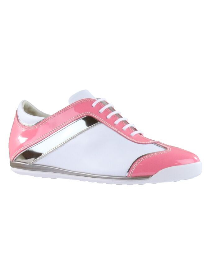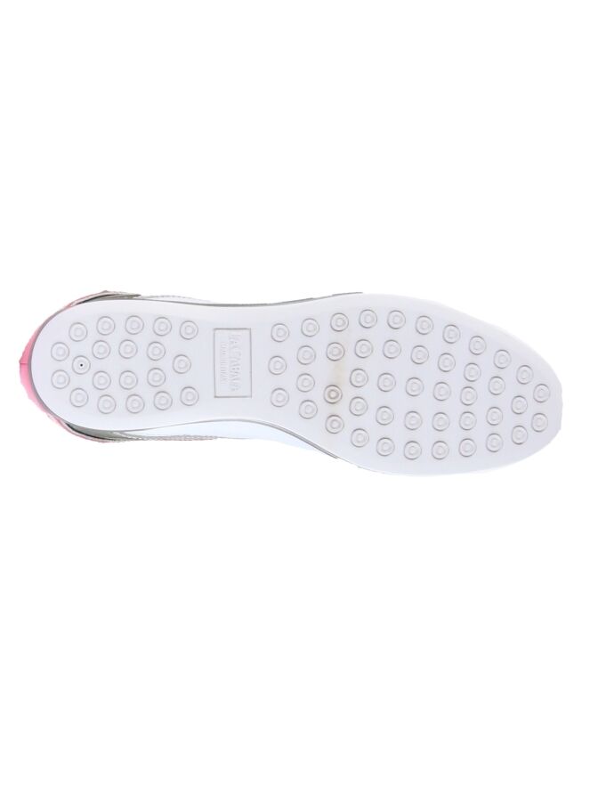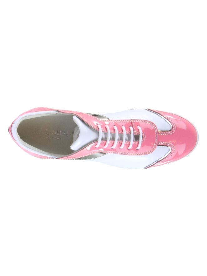 Een sneaker van La Cabala in de kleur wit met roze. Langs de schacht, op de hiel en op de neus is lakleder in een pink kleur. Langs de zijkanten is een bies in een platina kleur . De binnenzool is uitneembaar. De binnenkant is met leder gevoerd.