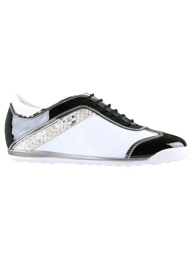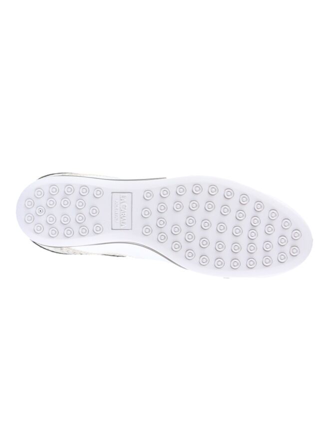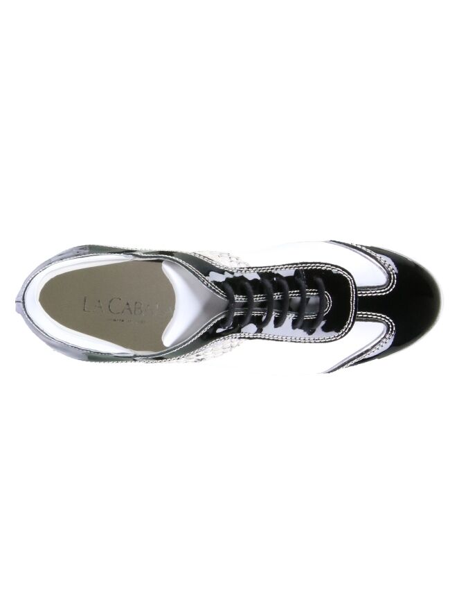 Een sneaker van La Cabala in de kleur wit. Langs de schacht, op de hiel en op de neus is zwart lakleder. Langs de zijkanten is een bies in een taupe kleurige pythonprint. De binnenzool is uitneembaar. De binnenkant is met leder gevoerd.