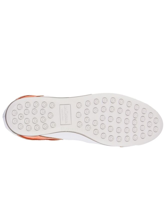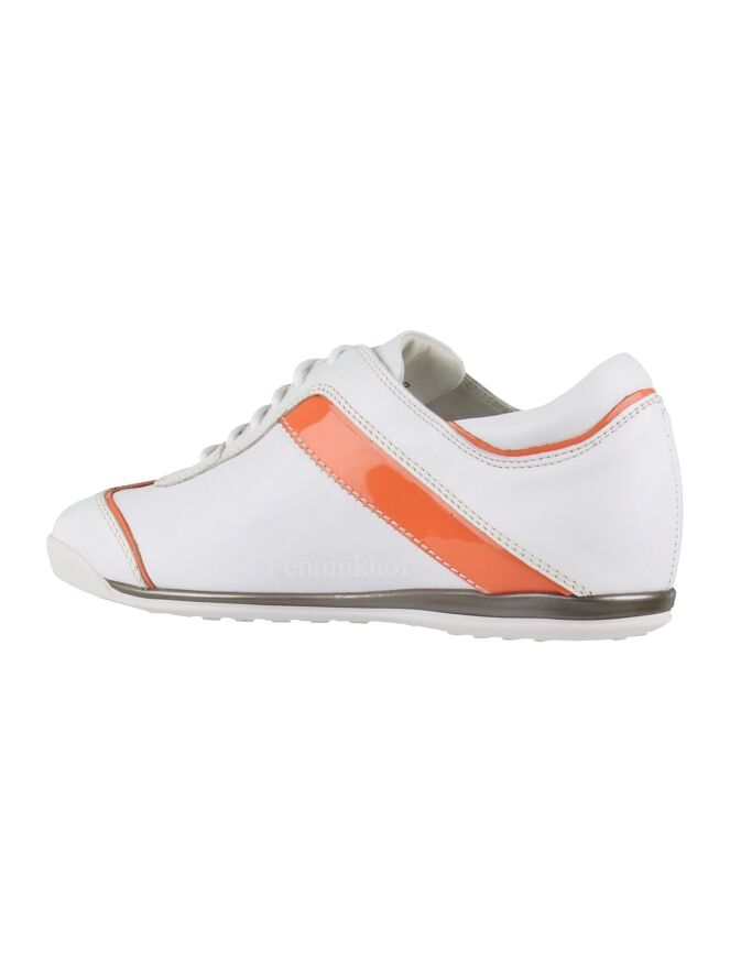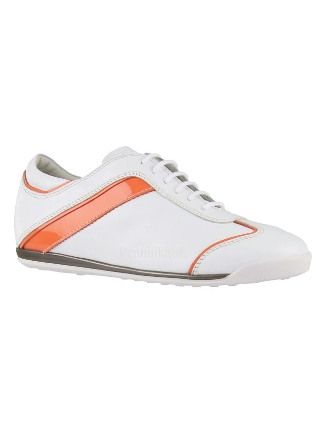 Een sneaker van La Cabala in de kleur wit. Aan de zijkanten, hiel en langs de voorvoet is een oranje bies in lakleder. De binnenzool is uitneembaar. De binnenkant is met leder gevoerd.