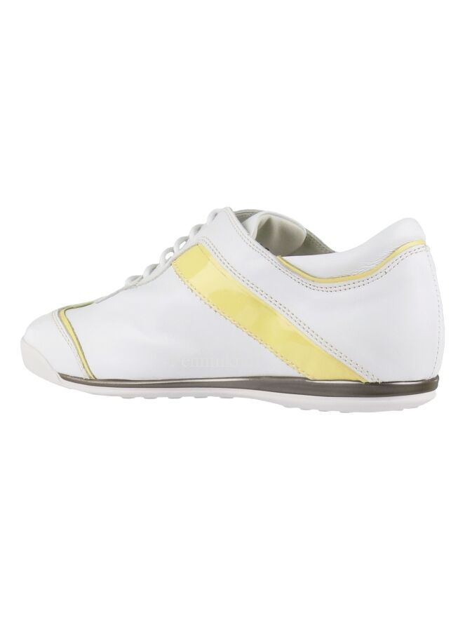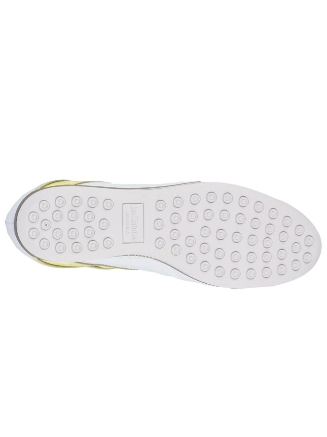 Een sneaker van La Cabala in de kleur wit. Aan de zijkanten, hiel en langs de voorvoet is een pastel gele bies in lakleder. De binnenzool is uitneembaar. De binnenkant is met leder gevoerd.
