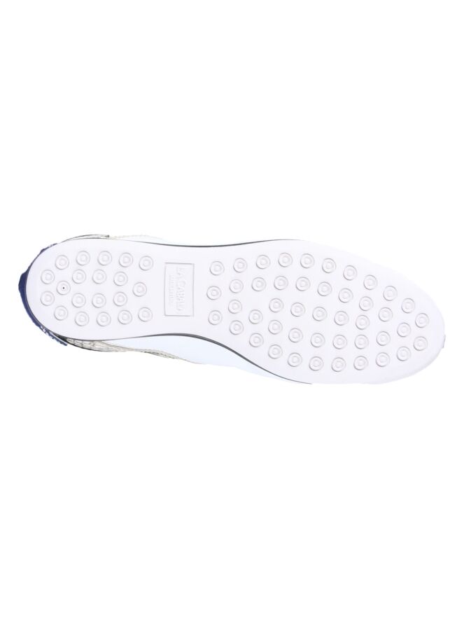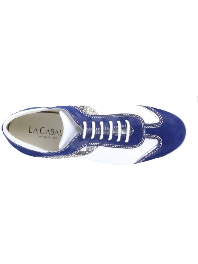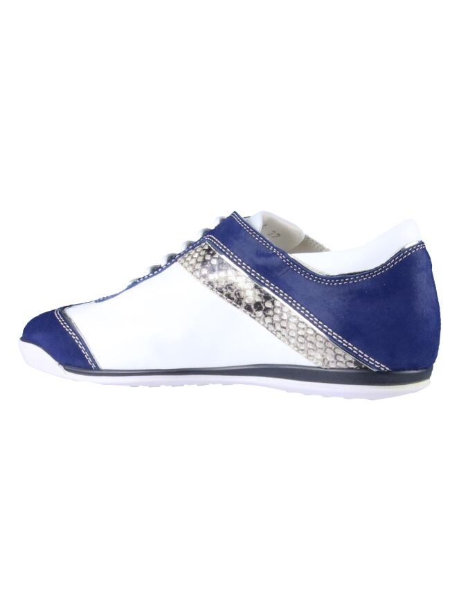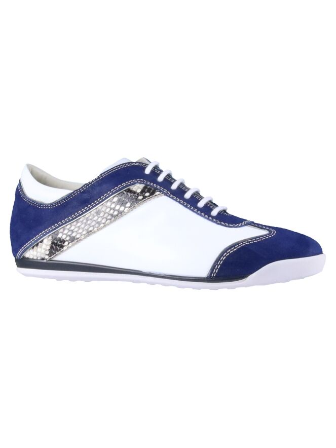 Een sneaker van La Cabala in de kleur wit. Langs de schacht, op de hiel en op de neus is mat glanzend suède in een nachtblauwe kleur. Langs de zijkanten is een bies in een taupe kleurige pythonprint. De binnenzool is uitneembaar. De binnenkant is met leder gevoerd.