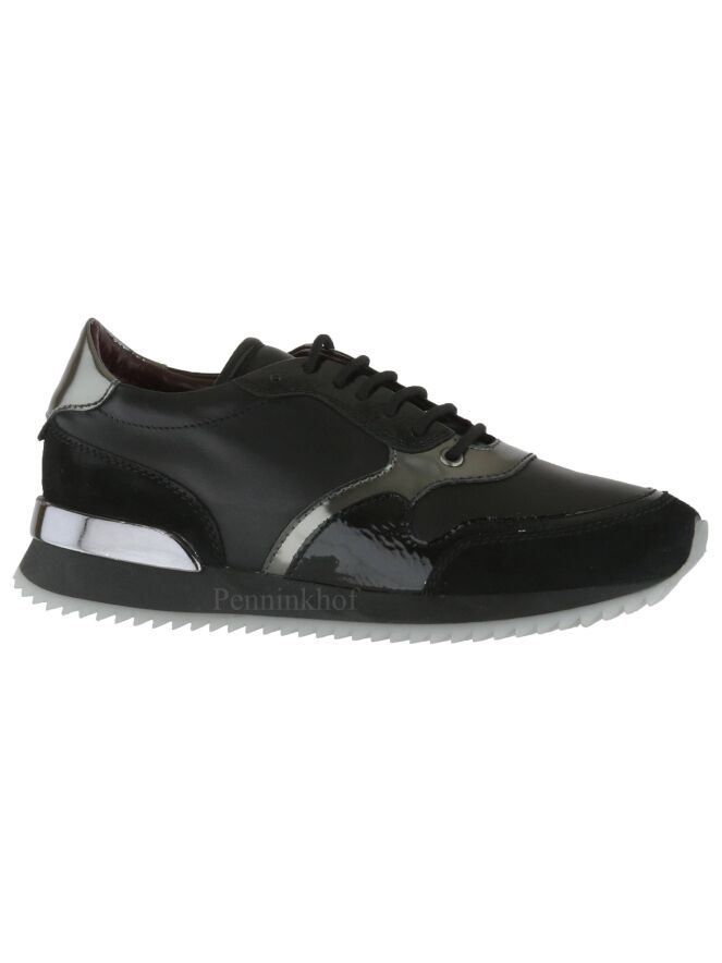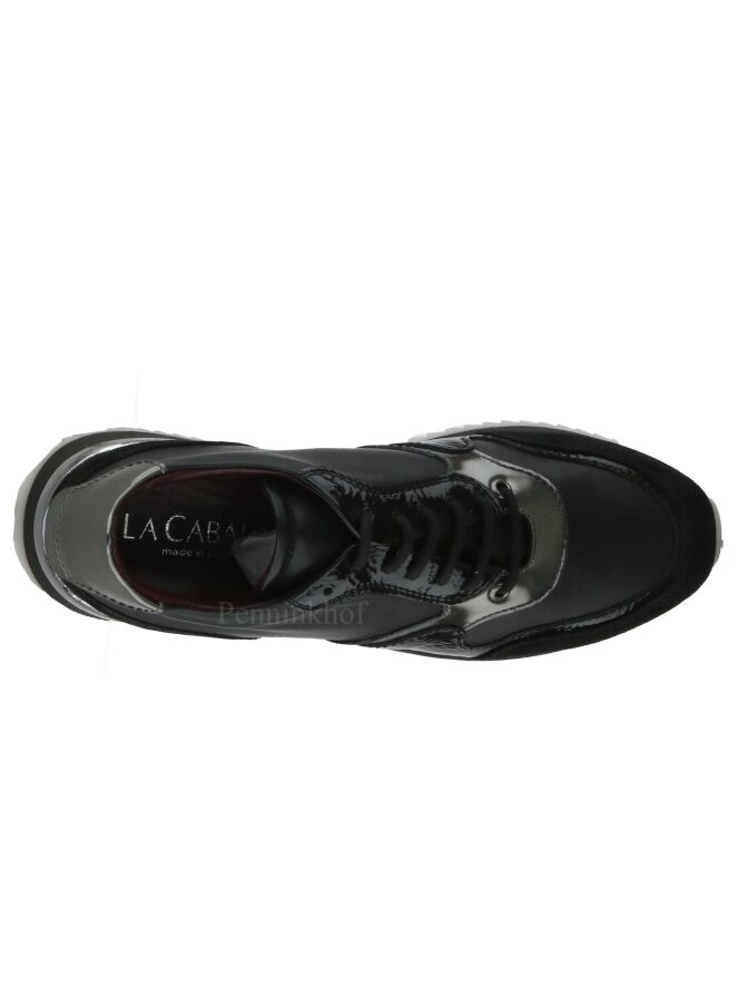 Een sneaker van La cabala in de kleur zwart. Vanaf de neus naar de zijkanten is zwart camoscio suède met een zwarte lak bies. Langs de veter is een nikkel kleurige bies. Op de hiel zijn 2 nikkelkleurige delen. De fijne kartelzool is in een licht en donkergrijze kleur. De binnenkant is met leder gevoerd en de binnenzool is uitneembaar.