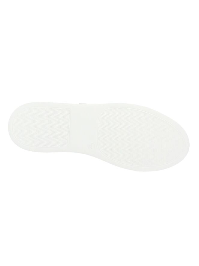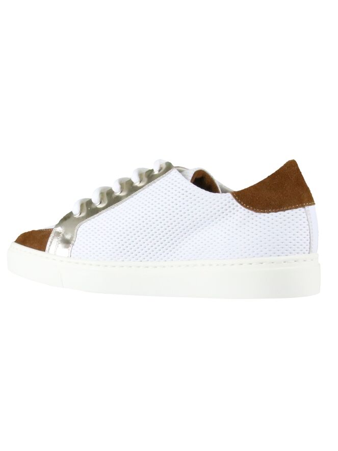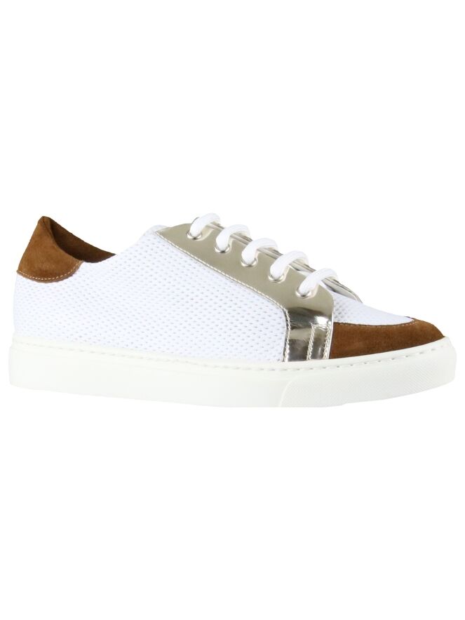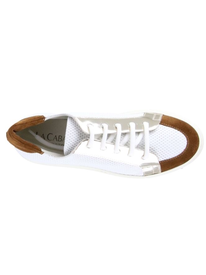 Een sneaker van La Cabala in de kleur wit. Het leder is fijn geperforeerd. Op de hiel en langs de voorzijde van de neus is cognac kleurig suède. Langs de dikke veters is aan beide zijden een lak bies in een platina kleur. De binnenzool is uitneembaar en de plateauzool is in de kleur roomwit.