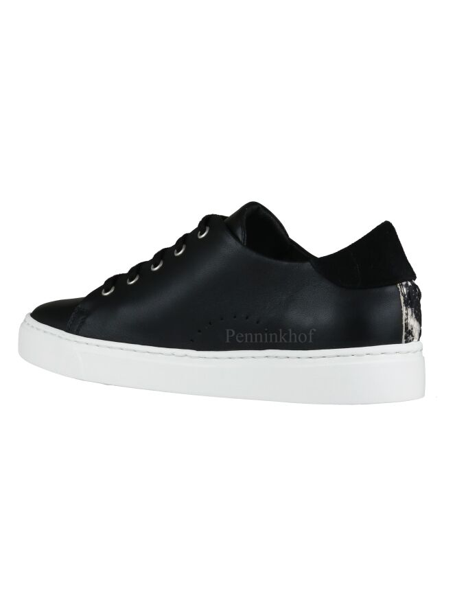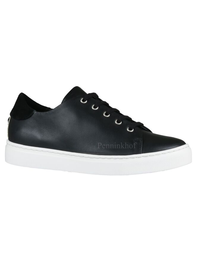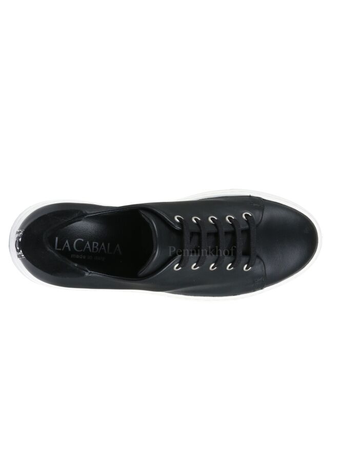 Een sneaker van La Cabala in de kleur zwart. Op de hiel is een suède stuk in de kleur zwart. De binnenzool is uitneembaar. De binnenkant is met leder gevoerd.