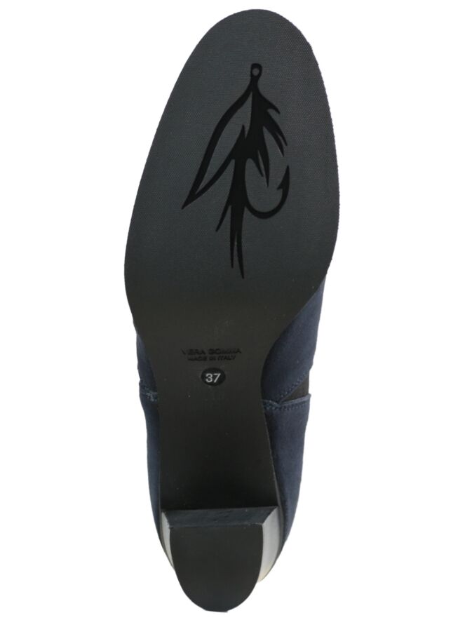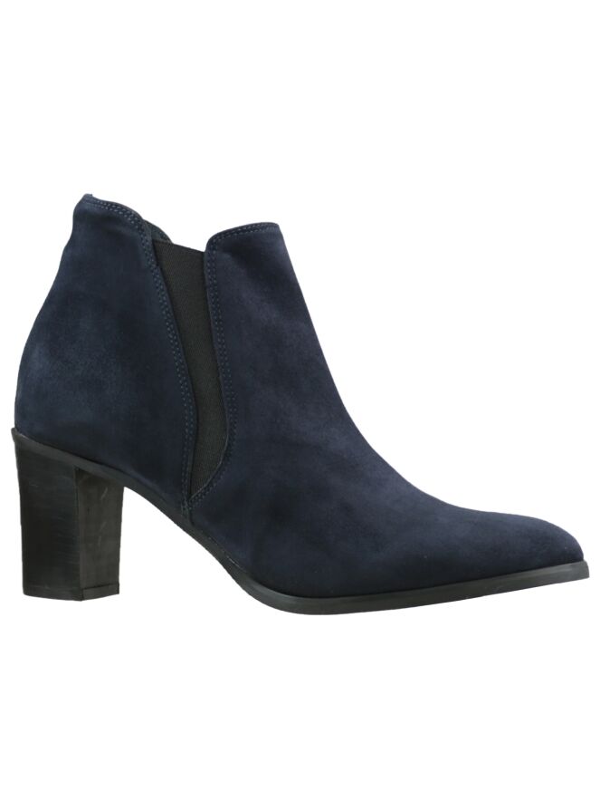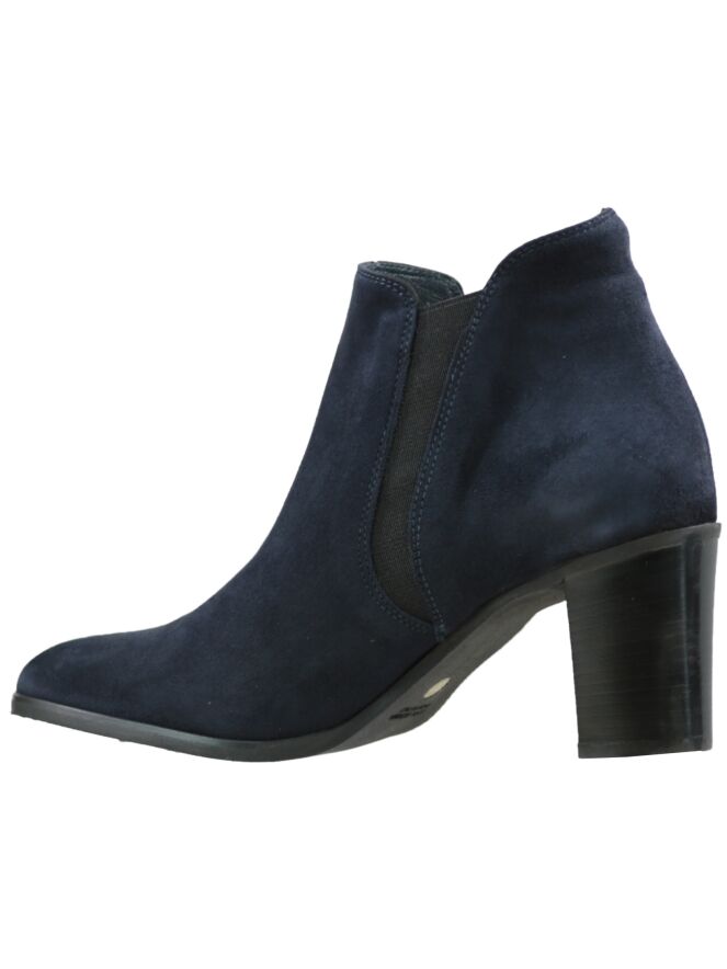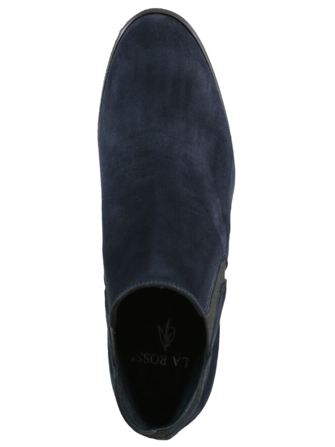 Een kort enkellaarsje in de kleur marine blauw van het merk La Ross. Het laarsje heeft een ronde neus en langs beide zijden is een diagonaal elastieken stuk stof ingezet. De blokhak is in een neutrale zwarte kleur. De schacht hoogte is vanaf de hiel 11 cm en de schacht omtrek is 26 cm. de binnenkant van het laarsje is met leder gevoerd.