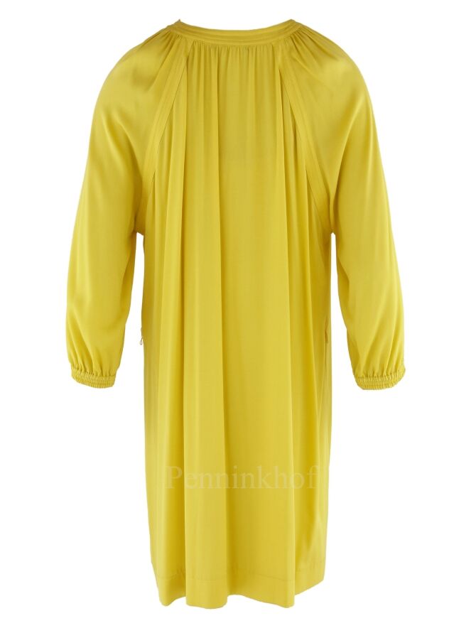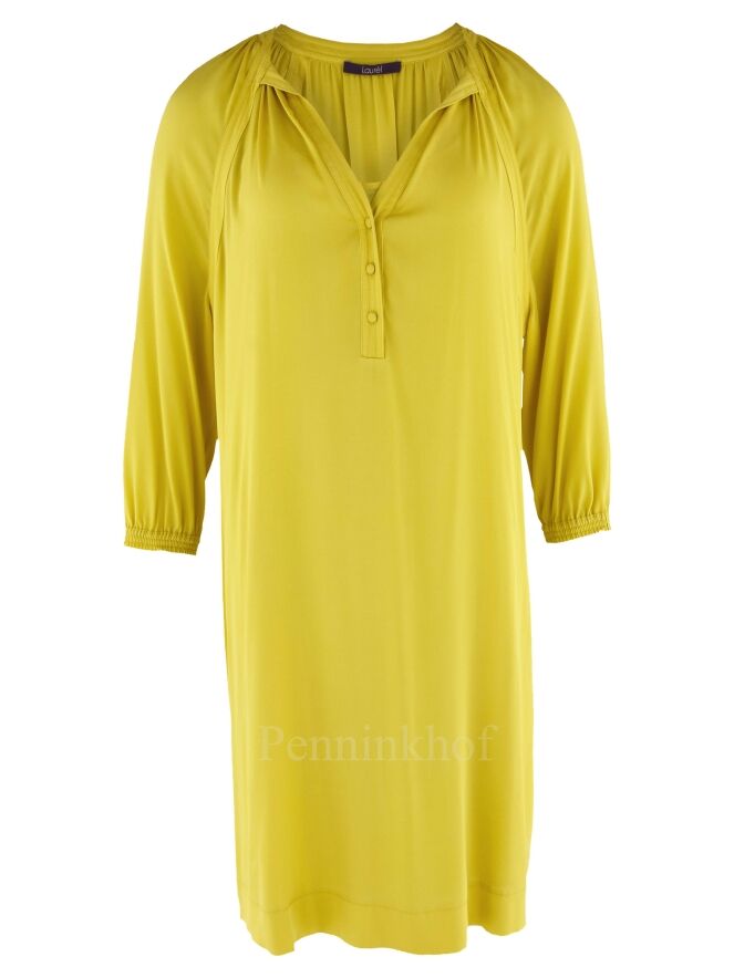 Een jurk van Laurel in een citroengele kleur. De jurk heeft een V - Hals met enkele knoopjes. Vanuit de rand van de hals aan de achterkant zijn fijne plooien. Aan het uiteinde van de halflange mouwen is een elastische bies. De jurk is gevoerd en mag niet worden gewassen.