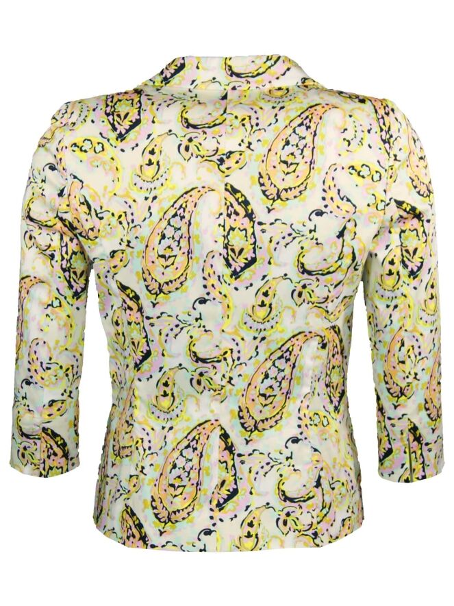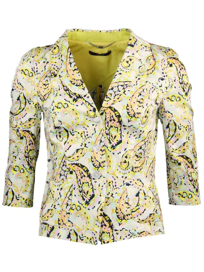 Een blazer van het merk Airfield in een frisse barok print met de kleuren geel, roze, wit en zwart. De blazer heeft een 3 knoops sluiting en is licht getailleerd. De mouw lengte is tot halverwege de onderarm en de blazer mag niet worden gewassen.