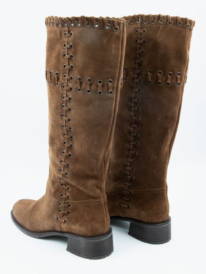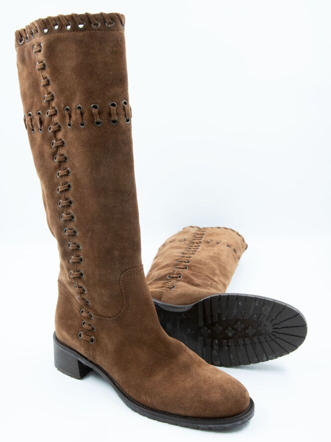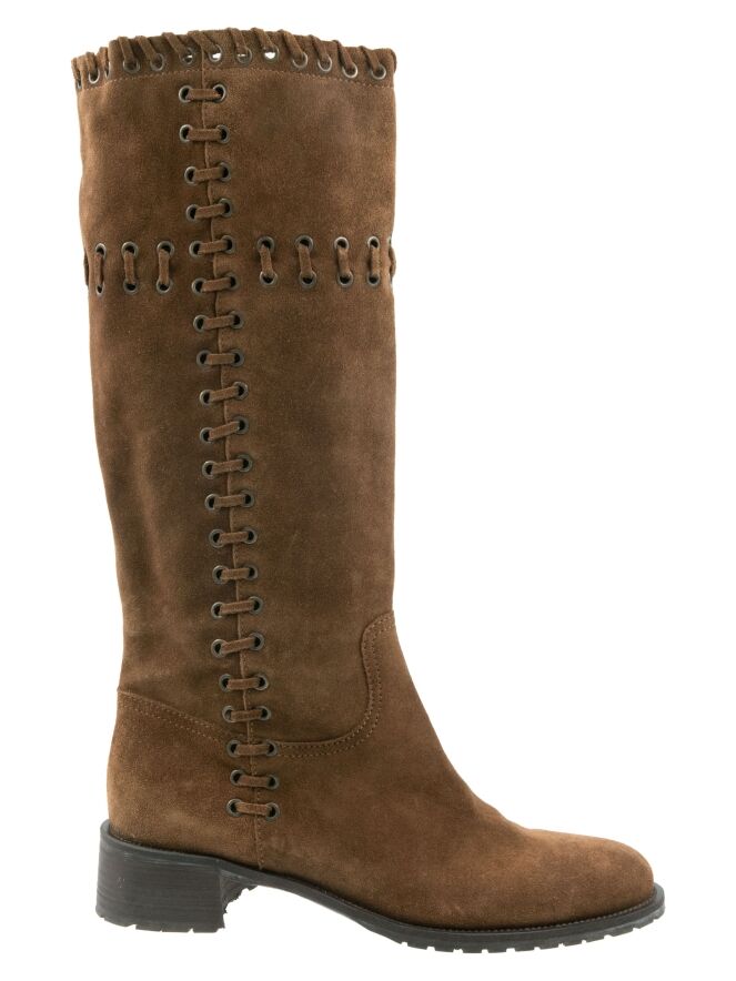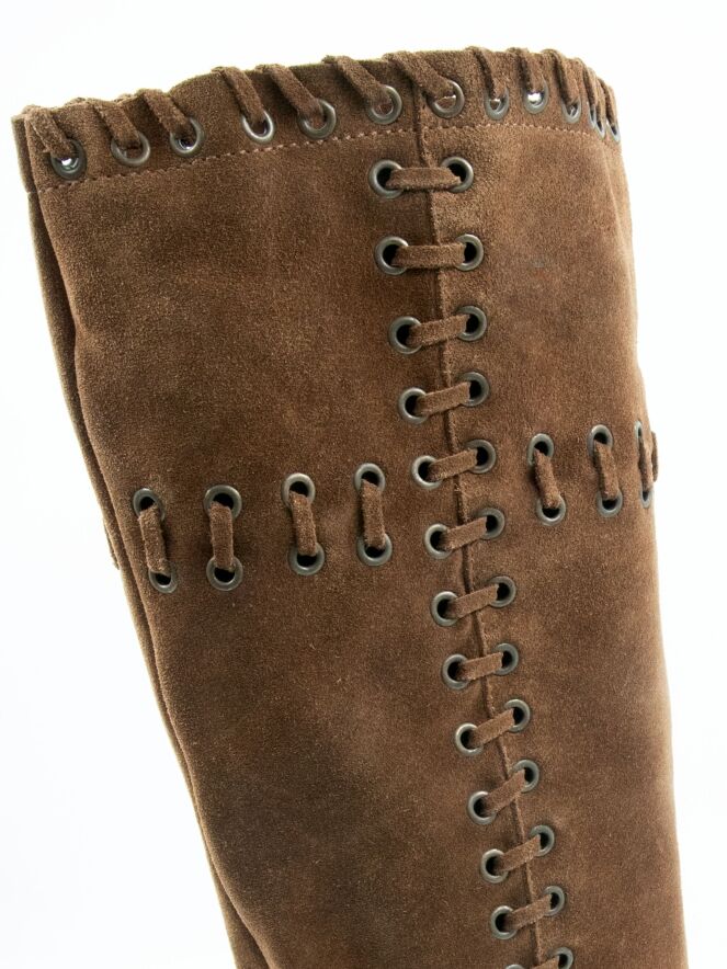 Een hoge laars van Luca Mode in de kleur cognac. Langs de buitenzijde van de schacht is over de gehele lengte een decoratief koord door koperkleurige ringen gevlochten. Langs de rand van de schacht en circa 10 cm daaronder is eenzelfde decoratie aangebracht. De binnenkant van de schacht is ongevoerd.
