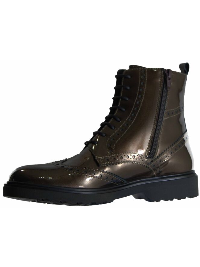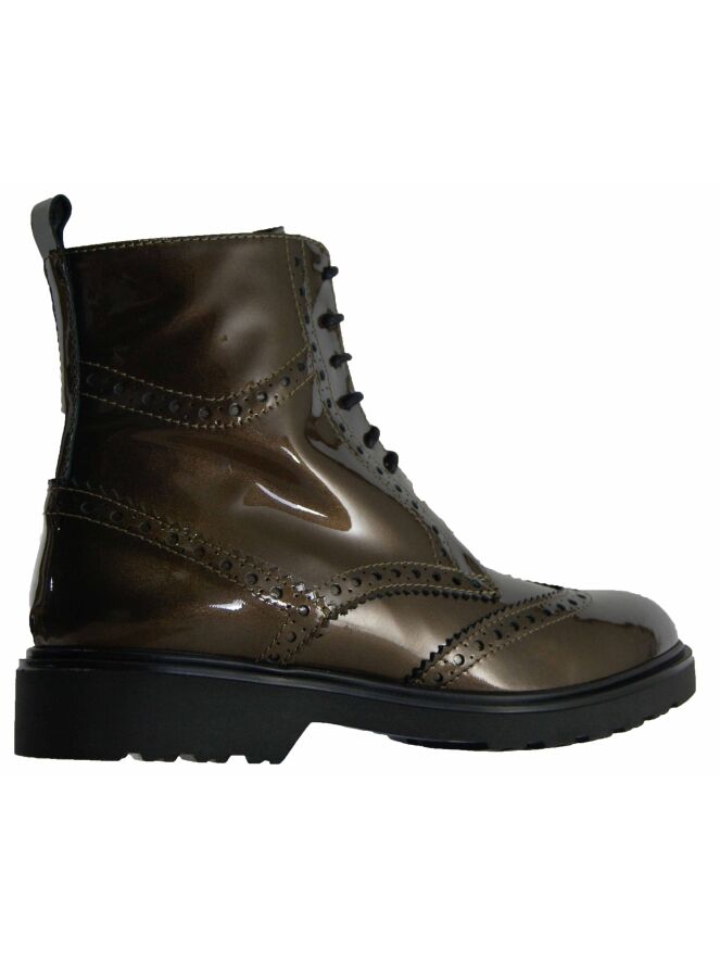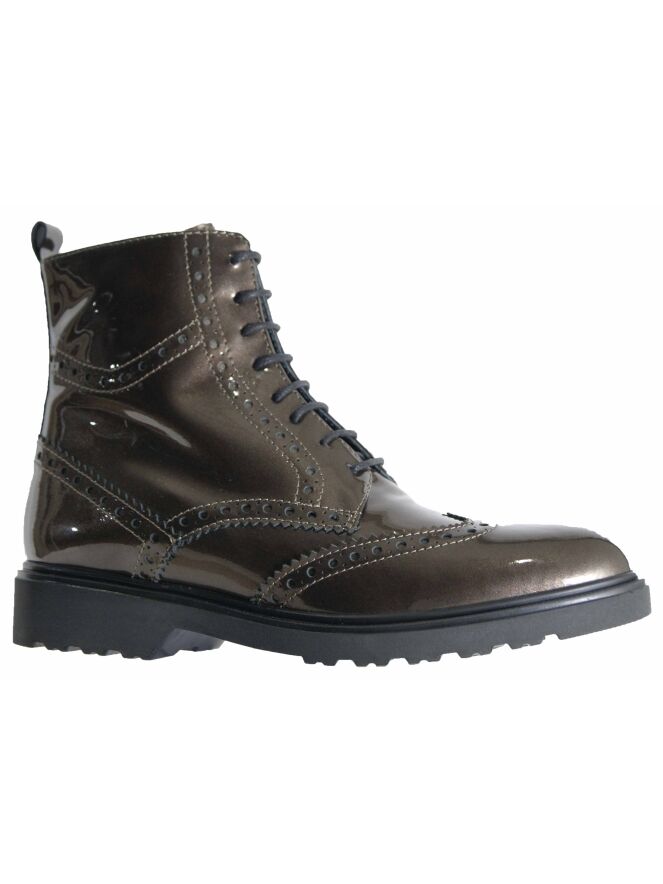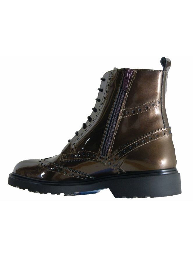 Een hoge veterschoen van het merk Luca mode in een lakleder in de kleur mokka bruin. De schoen is uitgevoerd in een brooks model en heeft een lederen binnenvoering.