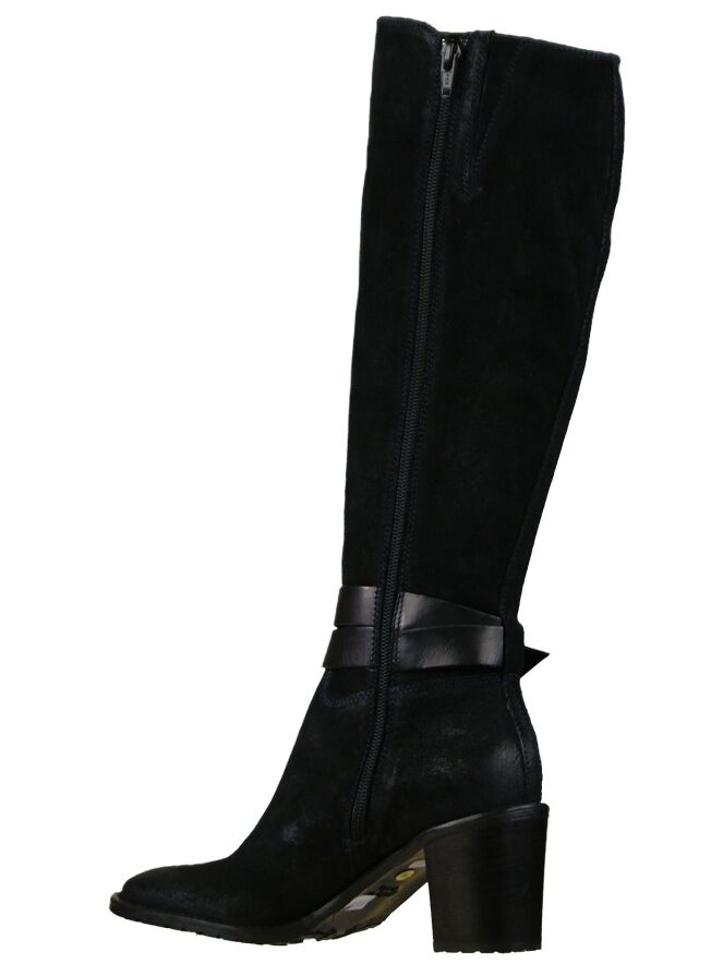 Een laars van het merk Luca Mode in de kleur zwart. Ronde de enkel is een lederen riempje met een zilver kleurige gesp. Aan de binnenzijde van de schacht is over de gehele lengte een rits. Aan de rand is een insnijding met een verborgen elastieken stuk. De hoogte van de schacht is 40 cm en de omtrek is 36 cm
