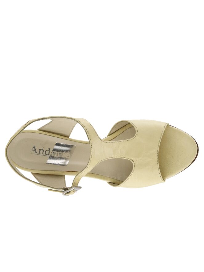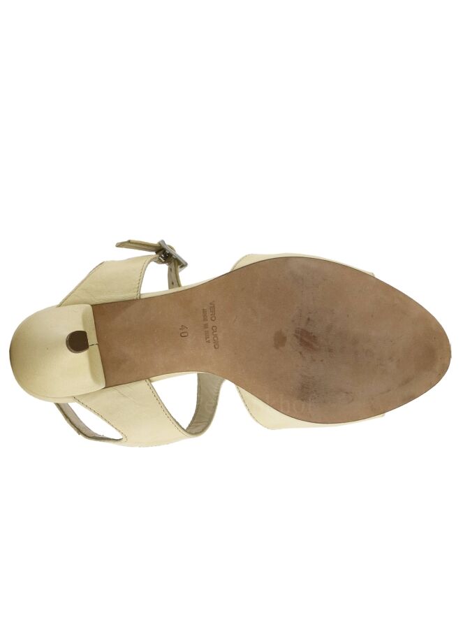 Een open pump van luca mode in de kleur vanille. De pump heeft een open teen en een verstelbaar hielbandje. De binnenkant is met leder gevoerd.