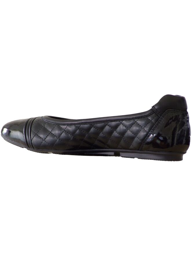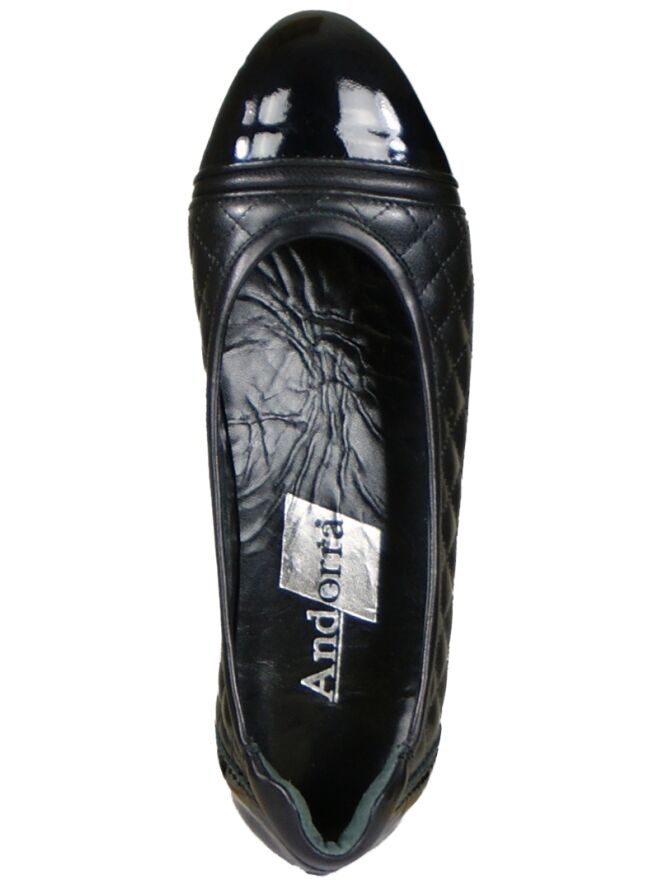 Een ballerina van Luca Mode in een zwarte kleur. Het leder is gestept gestikt. de neus van de ballerina is in een lak leder net als de hiel. De binnenkant is met leder gevoerd.