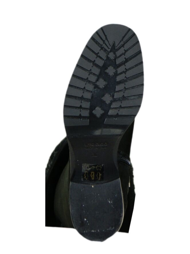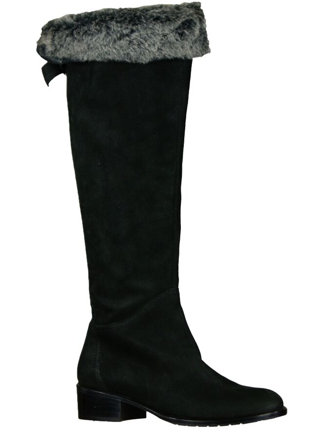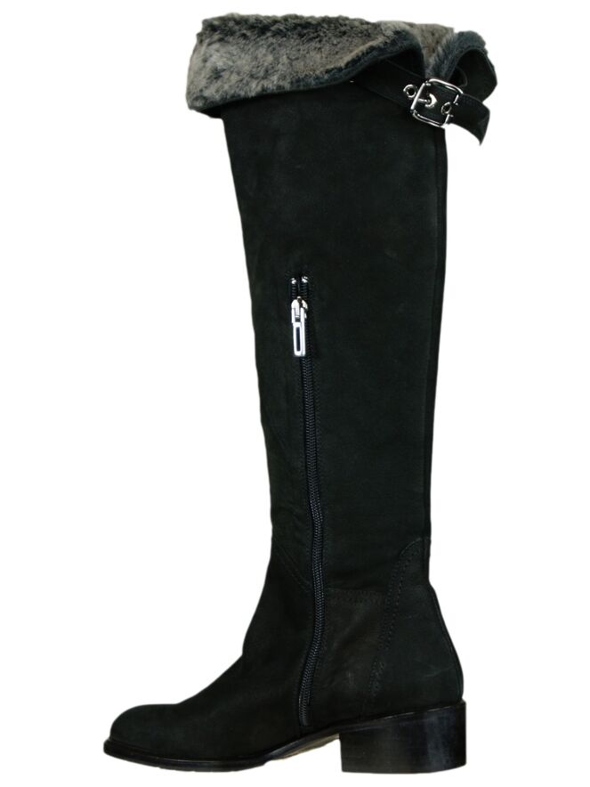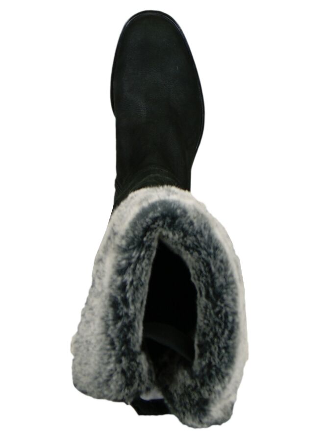 Een hoge laars van het merk Luca Mode in de kleur zwart in een sportief leder met aan de bovenkant van de schacht een korte omslag met imitatiebont. Aan de achterzijde van de schacht is een riempje met een gesp. Vanaf de zool tot ruim boven de kuit is aan de binnenzijde van de laars een rits ingezet.De hoogte van de schacht is 40 cm tot aan de bontrand en de omtrek is 37 cm.
