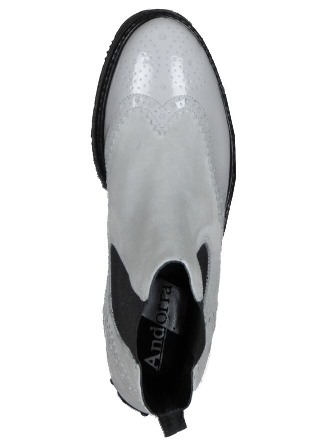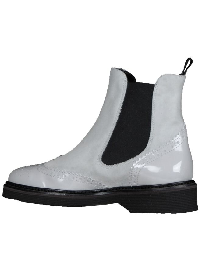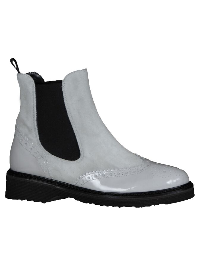 Een enkellaarsje van het merk Luca Mode in de kleur grijs. Het laarsje is in een brooks model en heeft aan beide zijden een elastieken stof ingezet. De brooks structuur is in lak en dit detail komt terug op de hiel. De binnenzijde van dit enkellaarsje is ongevoerd.