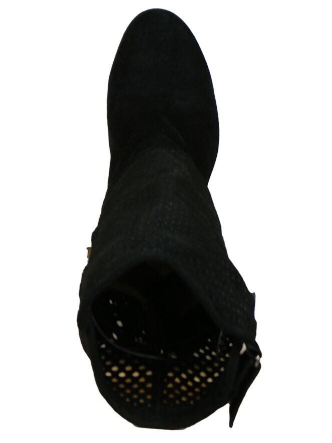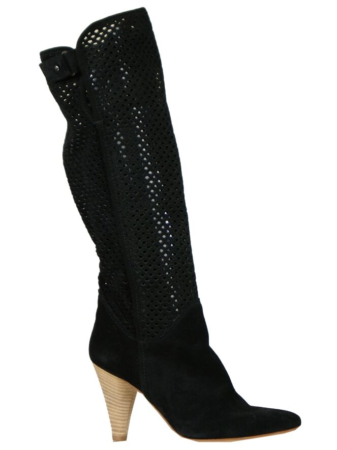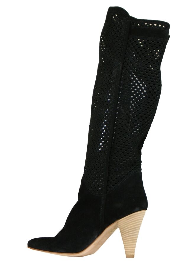 Een hoge laars van het merk Luca Mode in een zwarte kleur. De schacht van de laars is van geperforeerd leder welke tijdens het dragen enigszins naar beneden zakt. De elegante hak van de laars is in lichtbruin. De hoogte van de schacht is 42 cm en de omtrek is 37 cm.
