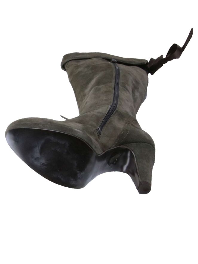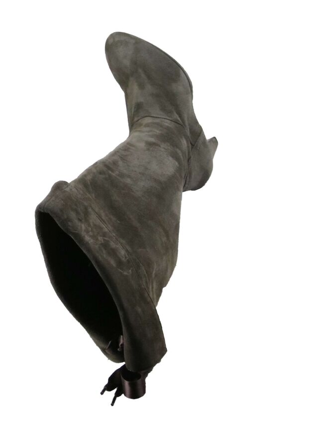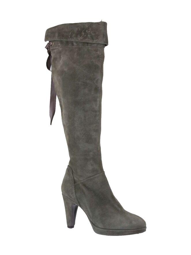 Een knielaars van het merk Luca Mode in een taupe kleur. De laars heeft een plateauzool van 2 cm. Aan de binnenzijde van de laars is een rits vanaf de zool tot aan de omslag. Aan de achterzijde van de omslag is een veter verwerking van satijn. De hoogte van de schacht is 40 cm met een omslag van 6 cm. De omtrek van de laars is 36 cm.