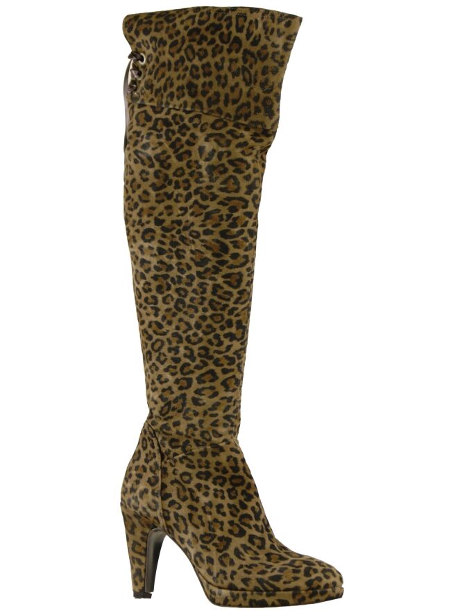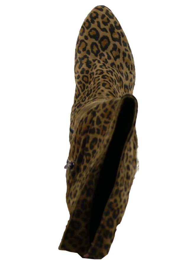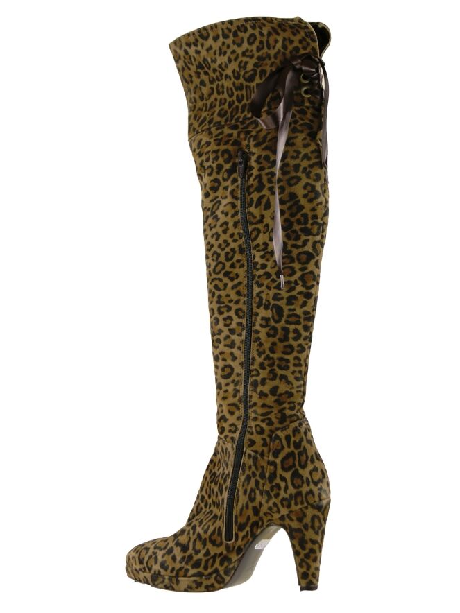 Een knielaars van het merk Luca Mode in een panterprint. De laars heeft een plateauzool van 2 cm. Aan de binnenzijde van de laars is een rits vanaf de zool tot aan de omslag. Aan de achterzijde van de omslag is een veter verwerking van satijn. De hoogte van de schacht is 40 cm met een omslag van 6 cm. De omtrek van de laars is 36 cm.