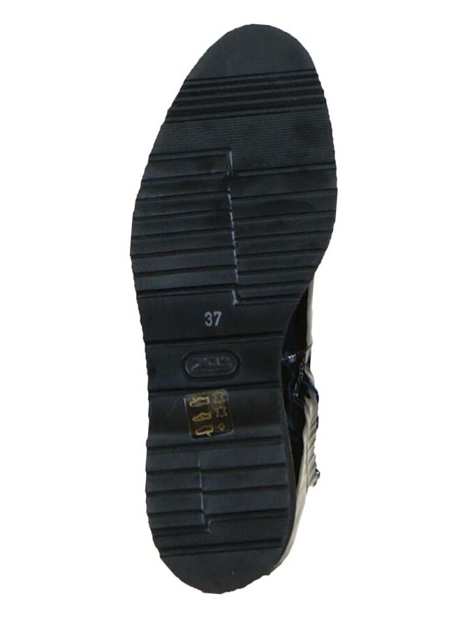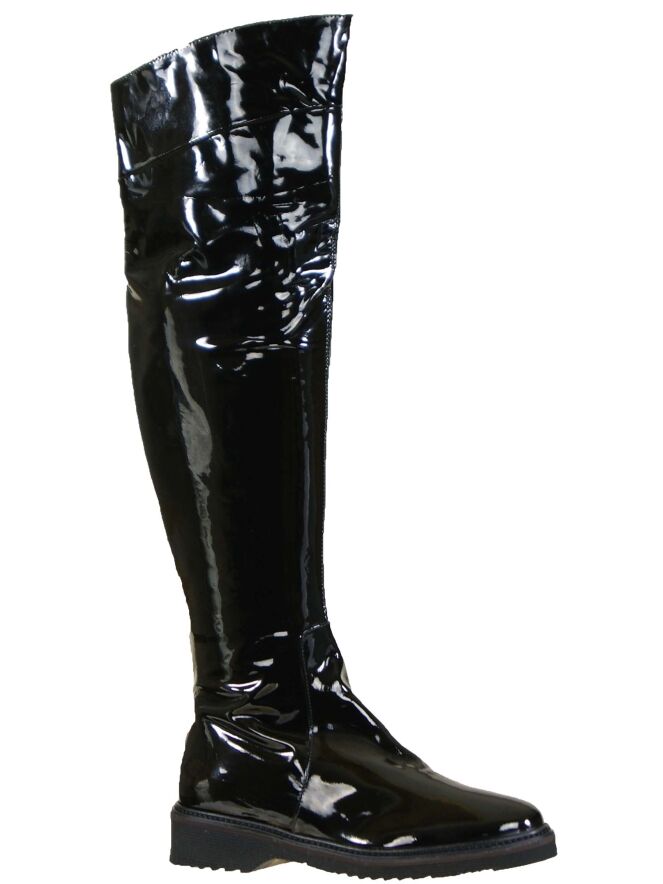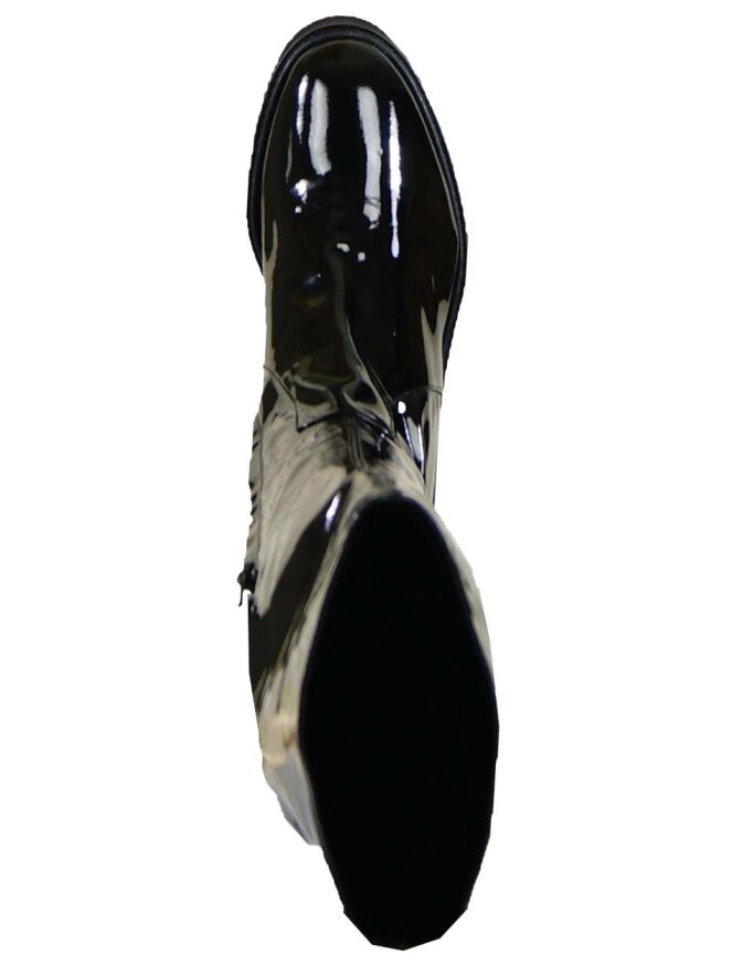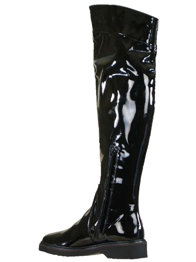 Een kuiplaars in het lakleder van het merk Luca Mode in de kleur zwart. De laars heeft een ronde neus en de hoogte van de schacht is 52 cm en de wijdte van de schacht is 37 cm. Aan de binnenzijde van de laars is vanaf de zool tot halverwege de laars een rits ingezet. De schacht is aan de binnenzijde met leder gevoerd.