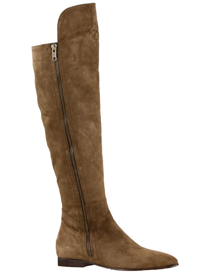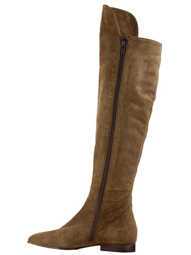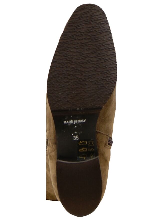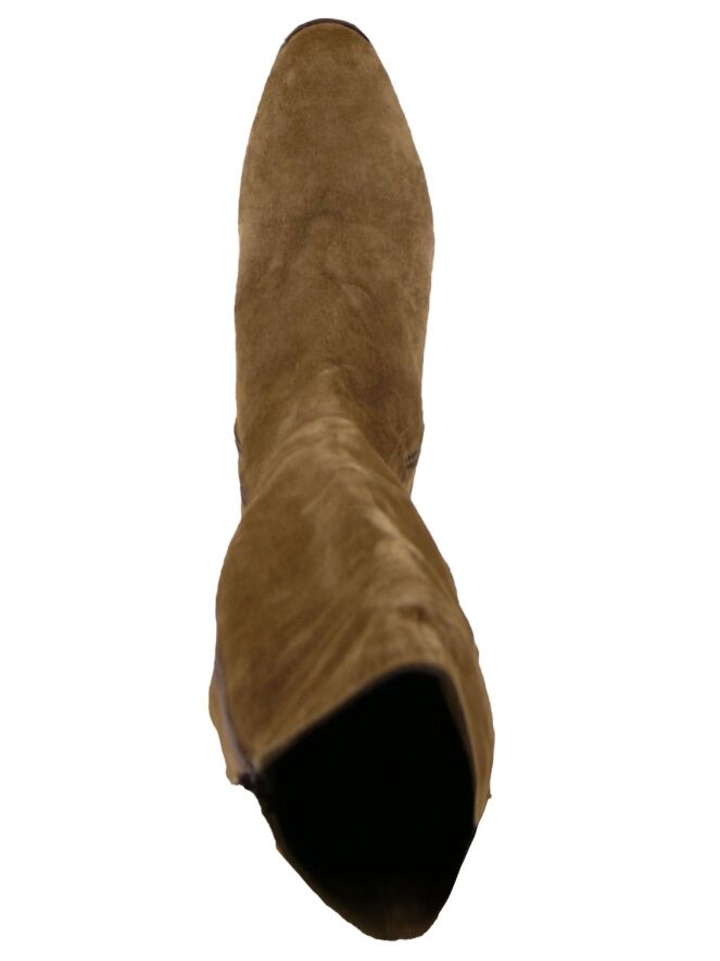 Een kaplaars van het merk Luca Mode in een bruine kleur. Aan de buitenzijde van de laars is een sier rits en aan de binnenzijde een rits vanaf de zool tot aan de bovenkant van de schacht. De kap van de laars kan worden omgeslagen. De hoogte van de schacht is 43 cm en de omtrek is 37 cm.
