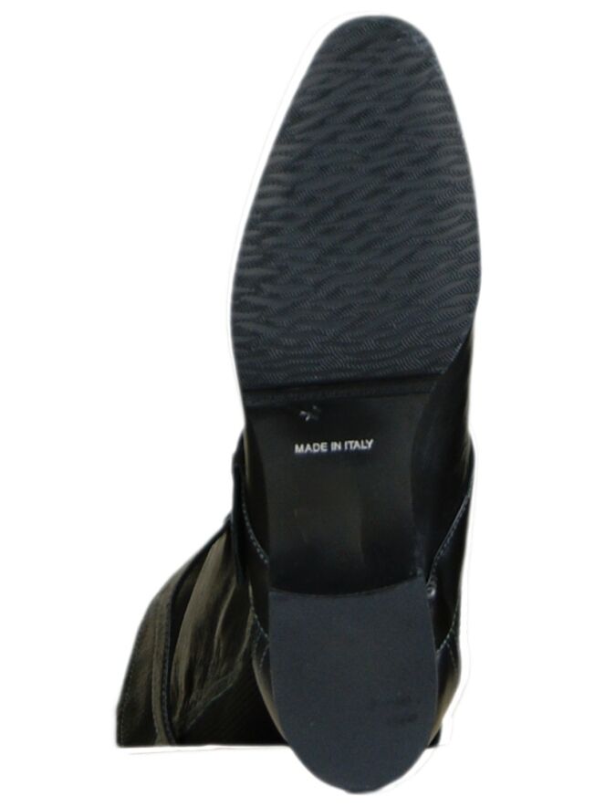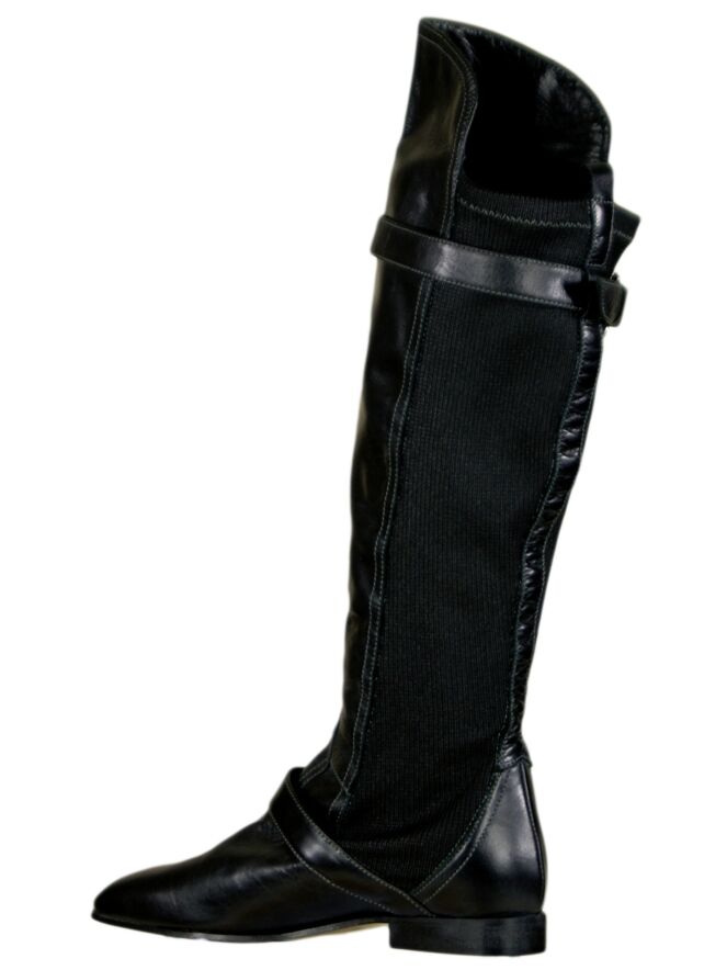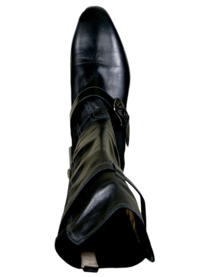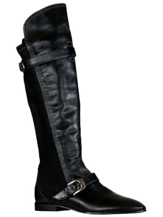 Een laars van het merk Luca Mode in de kleur zwart. De voorvoet is slank en over de voorvoet is een lederen band met een gesp. Dit detail komt terug aan de bovenzijde van de schacht. De achterzijde van de schacht is in een elastische stof. De hoogte van de schacht is 35 cm tot aan de omslag van 5 cm en de wijdte van de schacht is 35 cm. Het lederen deel van de schacht is van binnen met leder gevoerd.