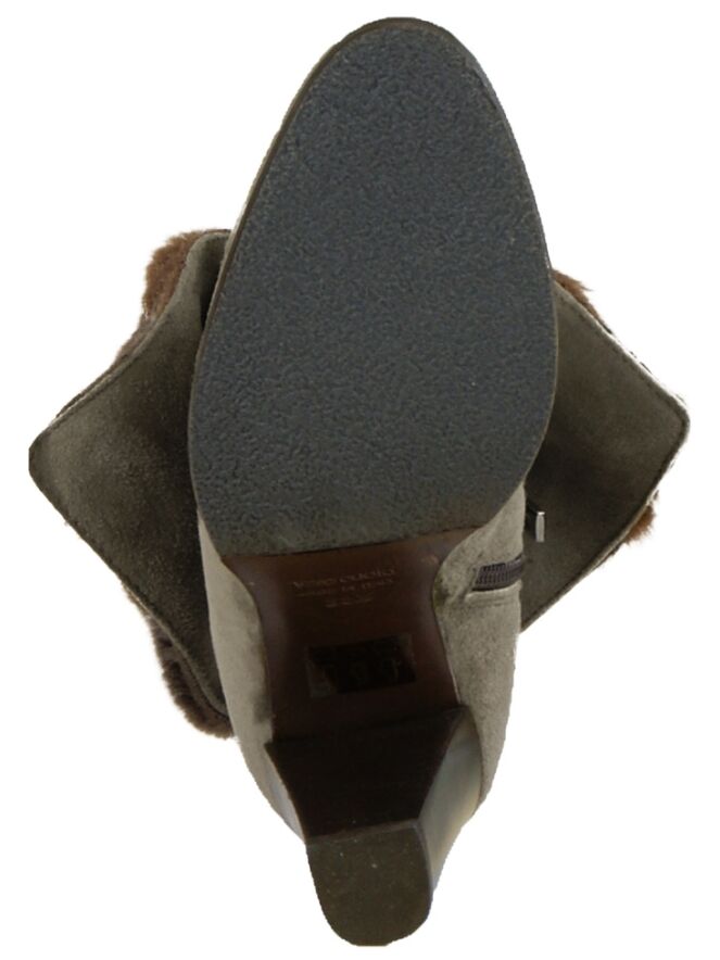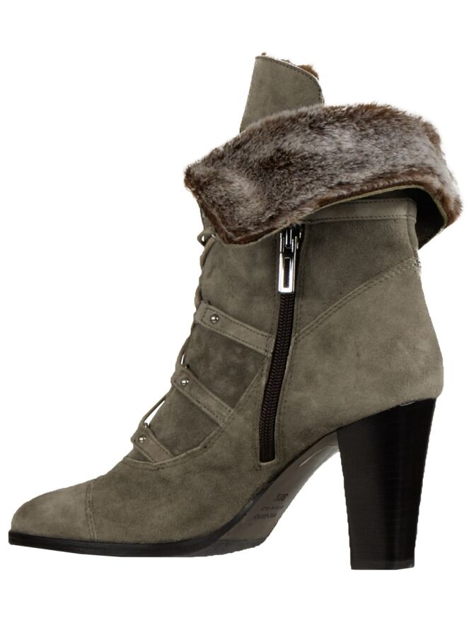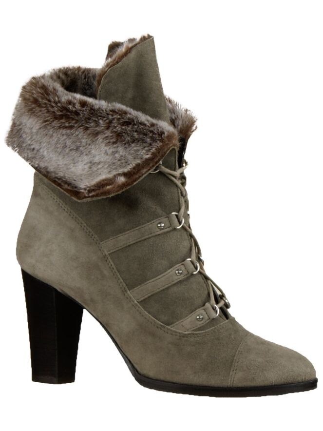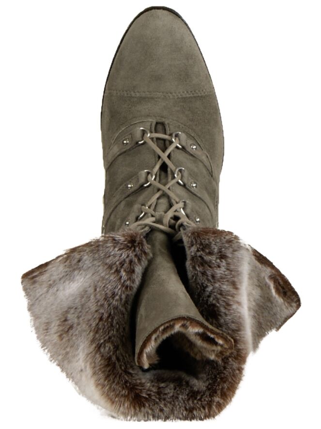Een enkel laarsje van het merk Luca Mode in de kleur taupe. Over de voorvoet is een veter die door kleine zilveren gespen gaat. De korte schacht kan worden omgeslagen en de binnenkant is met imitatie bont gevoerd.De binnenkant is onder het bont met leder gevoerd.