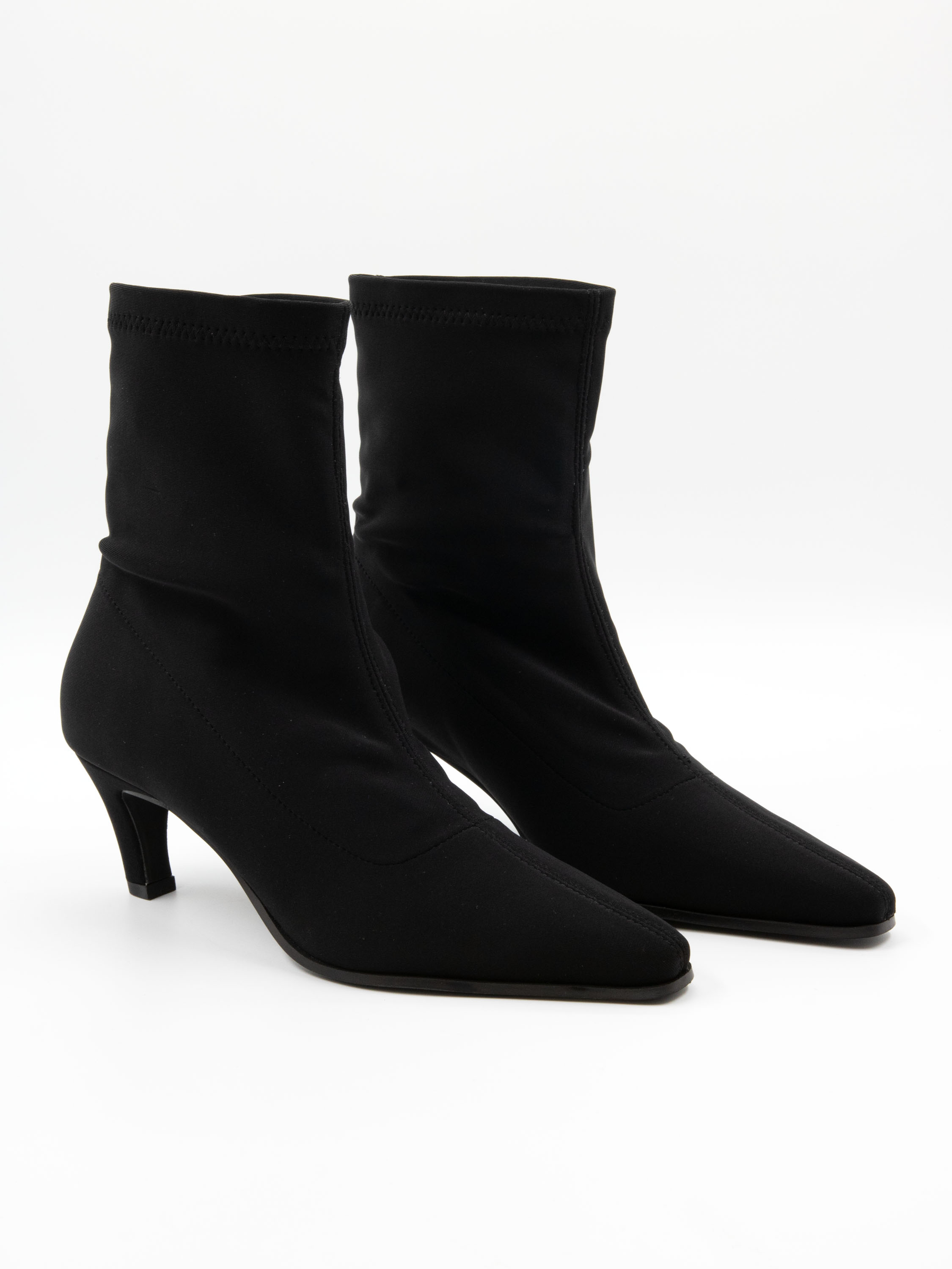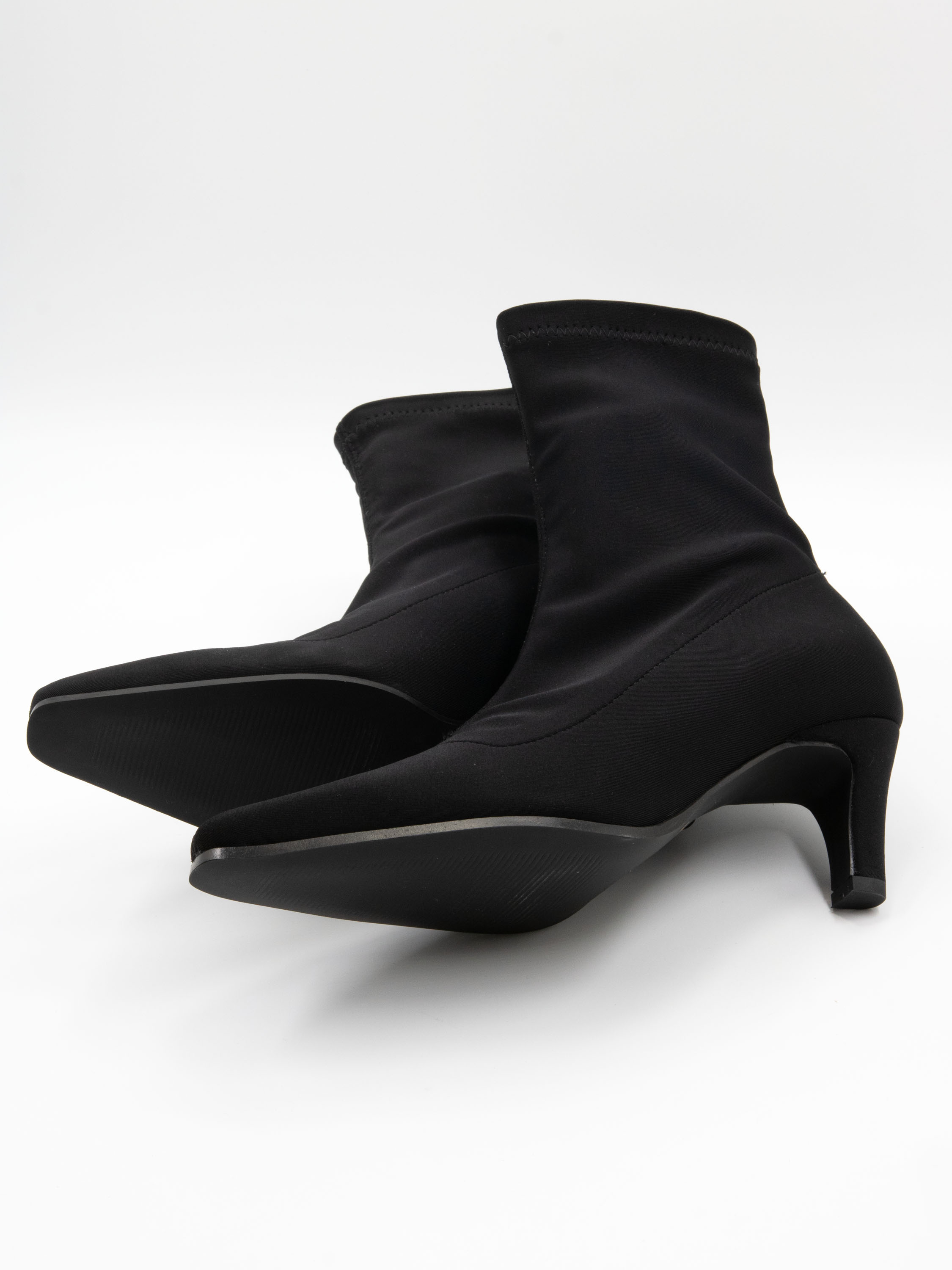 Een kort enkellaarsje van Madore in een elastische stof. Het laarsje heeft een slanke, puntige voorvoet en de soepele stof sluit elegant om de voet.