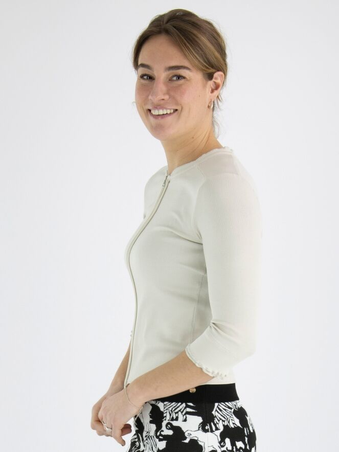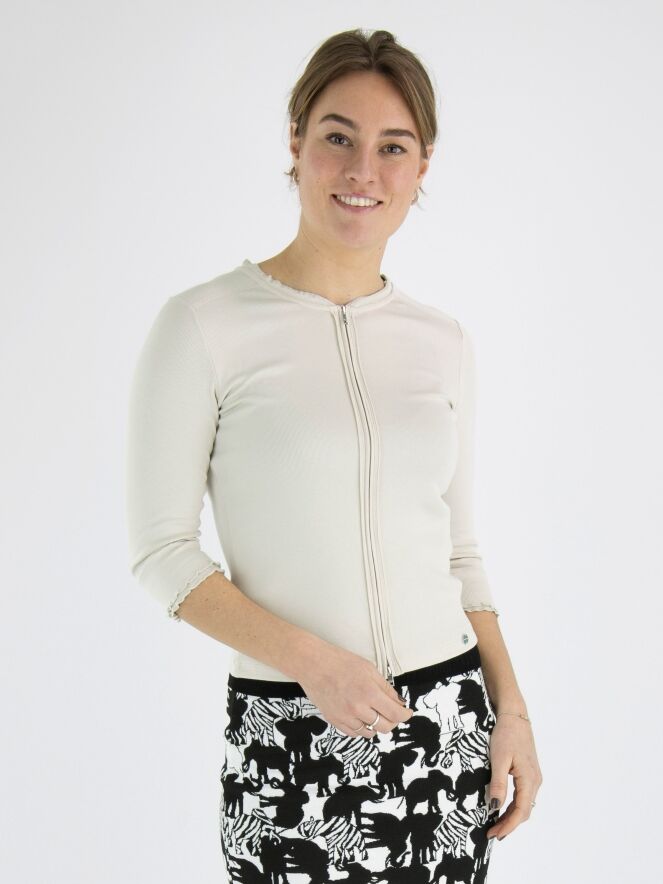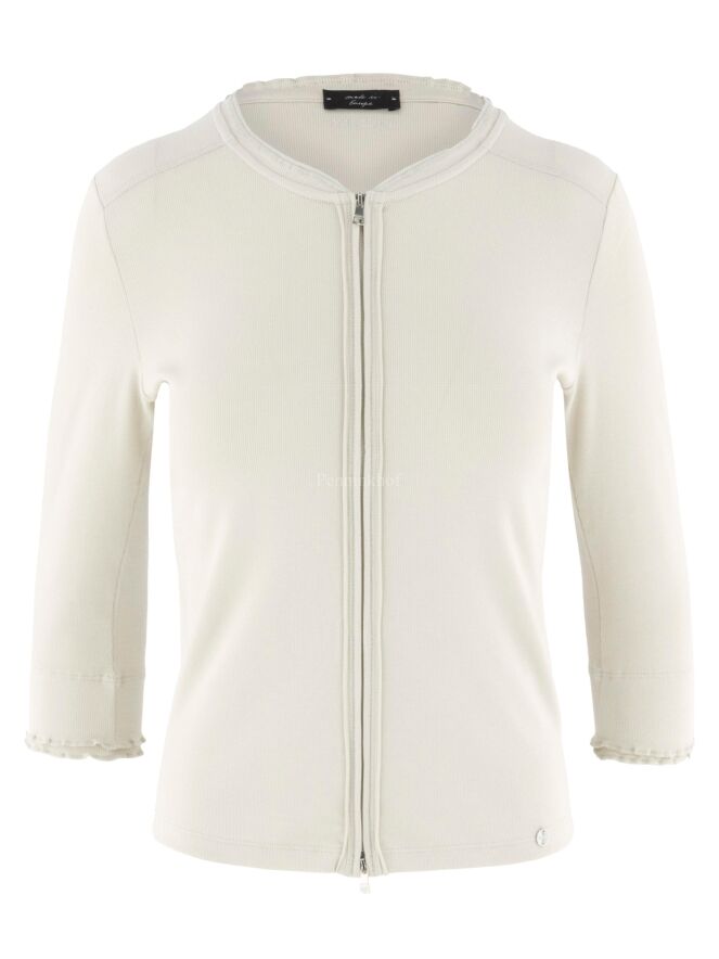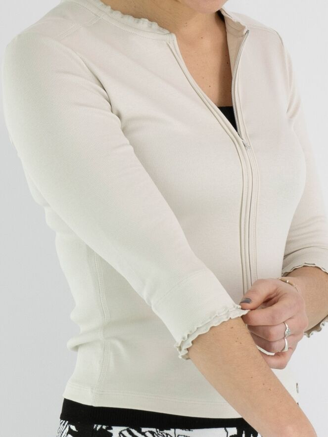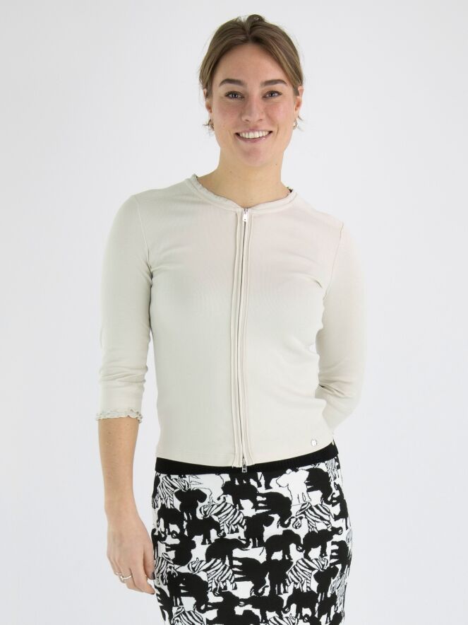 Een vest van het merk Marc Cain in de kleur zand. Het vest heeft half lange mouwen en een ronde hals. Langs de hals en de rits sluiting loopt een geribbelde band. Dit vest mag op 30 graden worden gewassen.