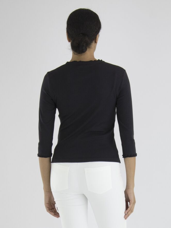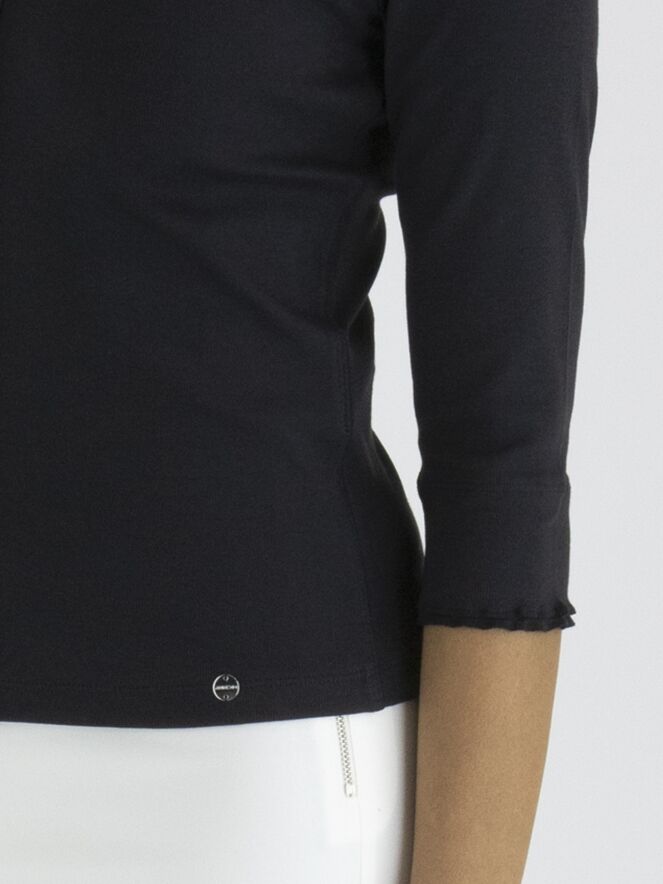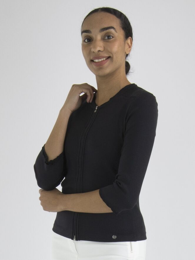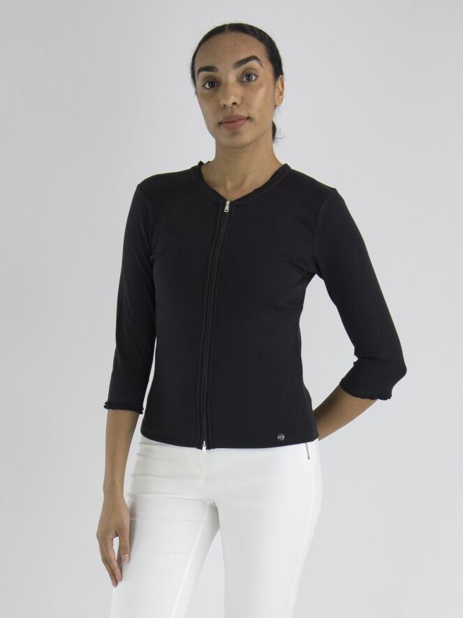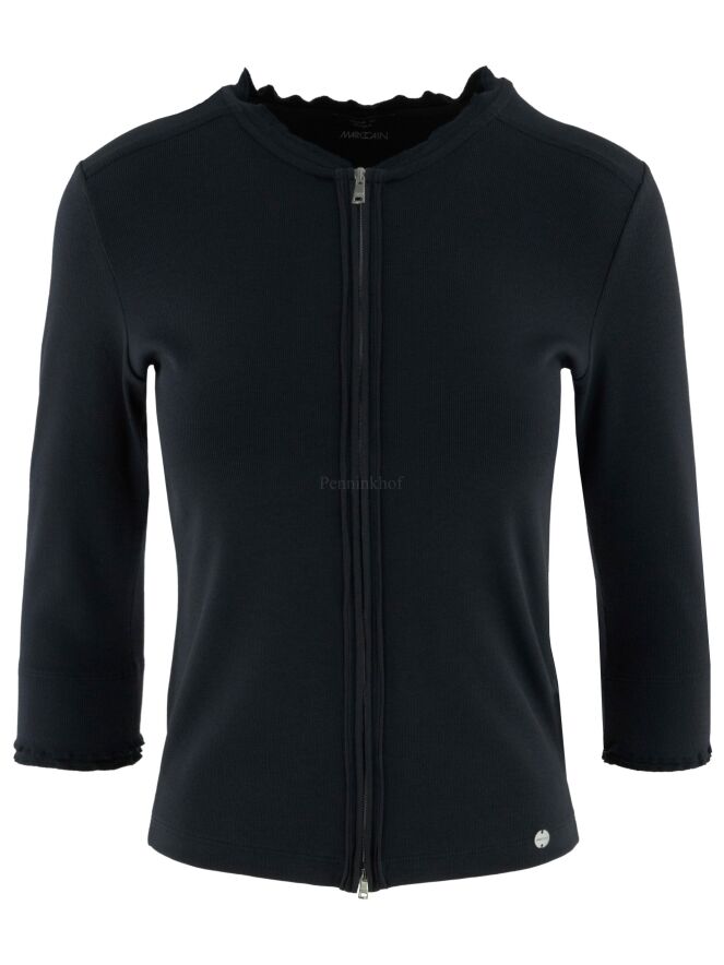 Een vest van het merk Marc Cain in de kleur marineblauw. Het vest heeft half lange mouwen en een ronde hals. Langs de hals en de rits sluiting loopt een geribbelde band. Dit vest mag op 30 graden worden gewassen.