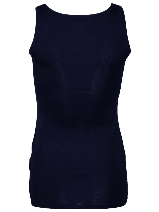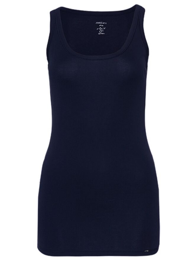 Een top van het merk Marc Cain uit de essentiels collectie in de kleur marine blauw. De top heeft een ronde hals en een schouderband van 3 cm breed. Deze top mag op 30 graden worden gewassen.