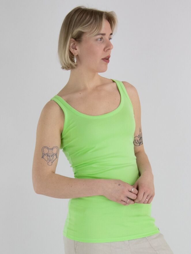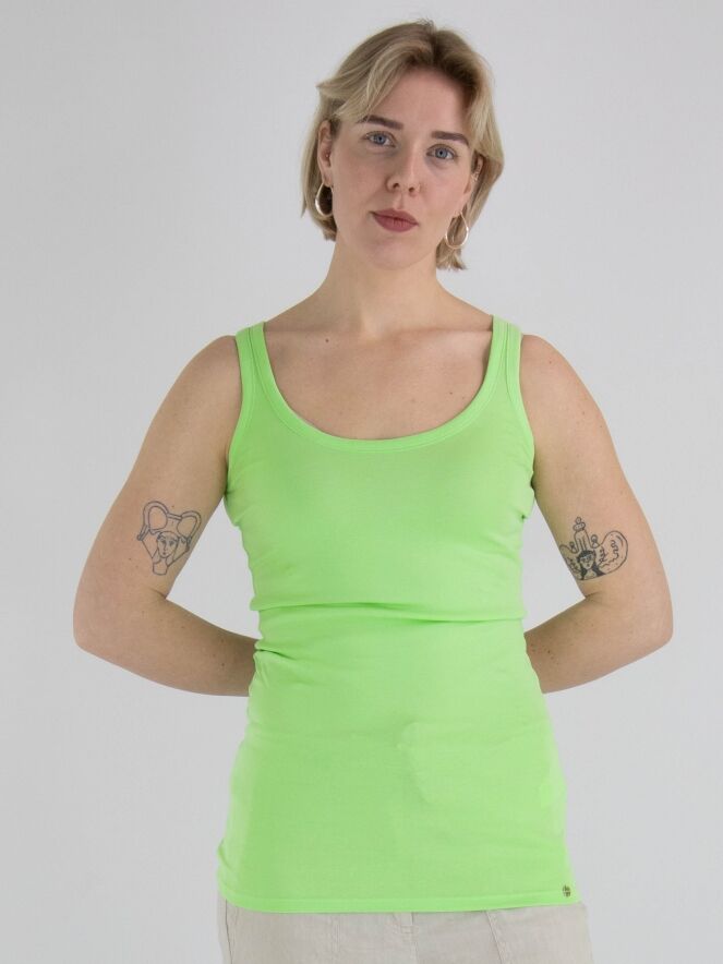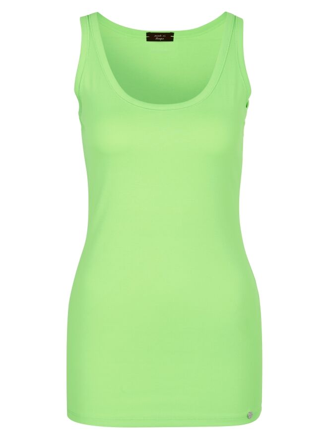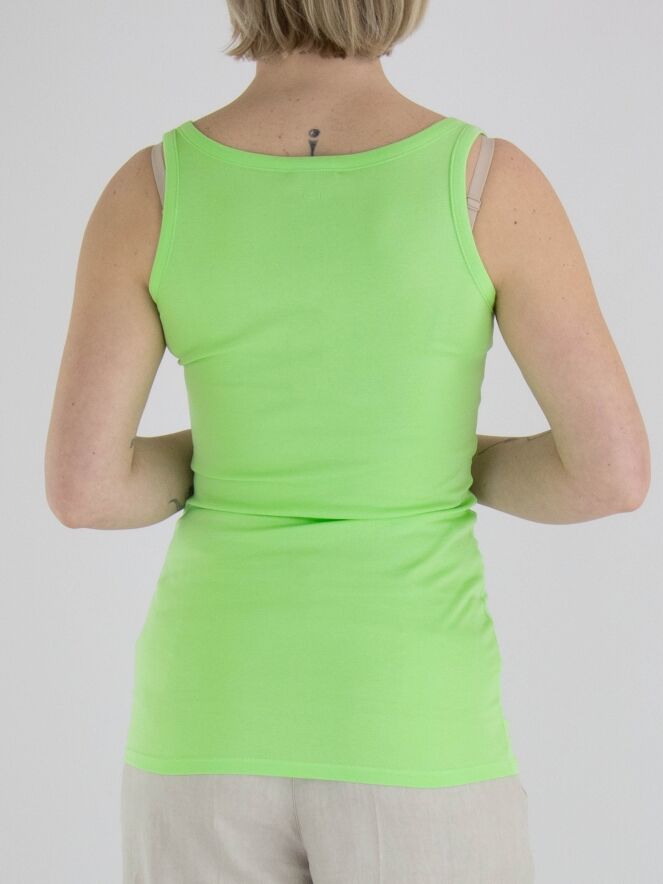 Een top van Marc Cain in de kleur pistache groen. De top heeft een ruime ronde hals en de schouderbandjes zijn 3 cm breed. Deze top mag op 30 graden worden gewassen.
