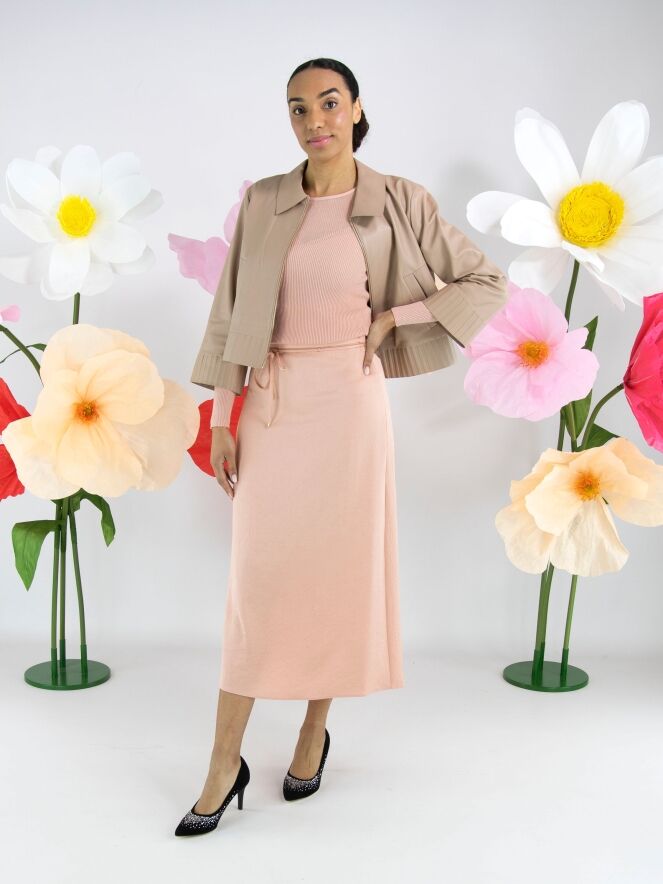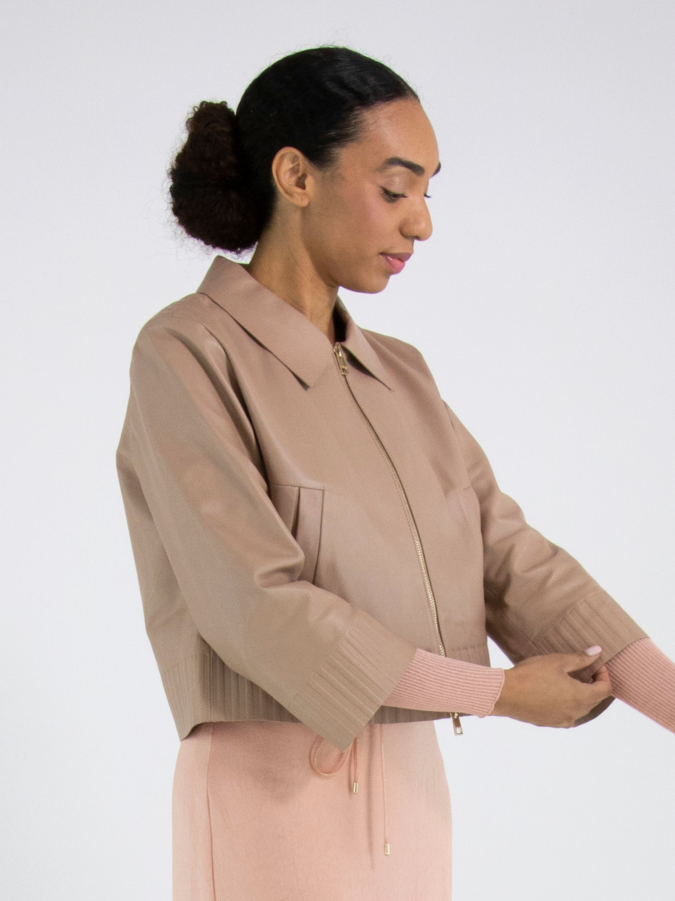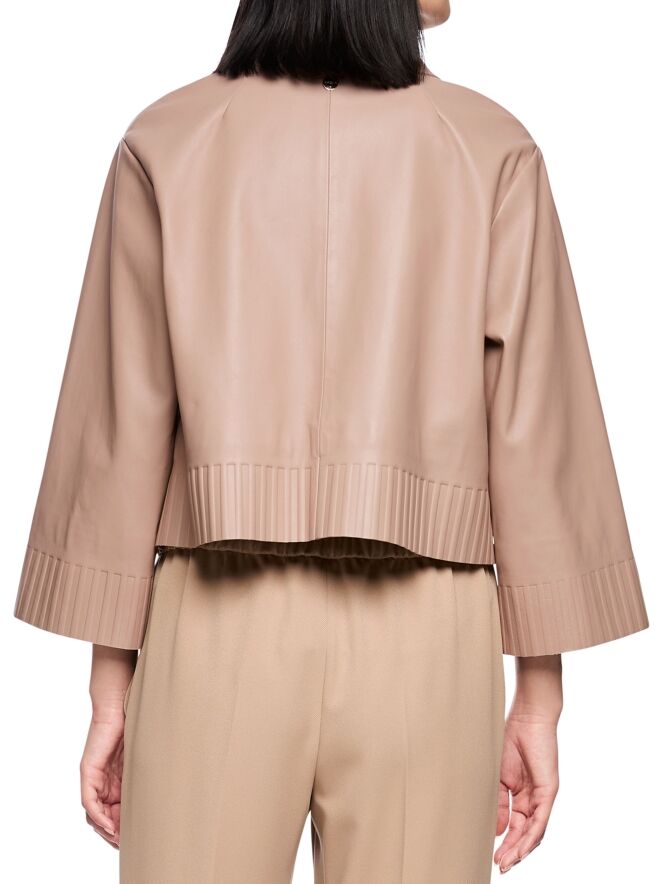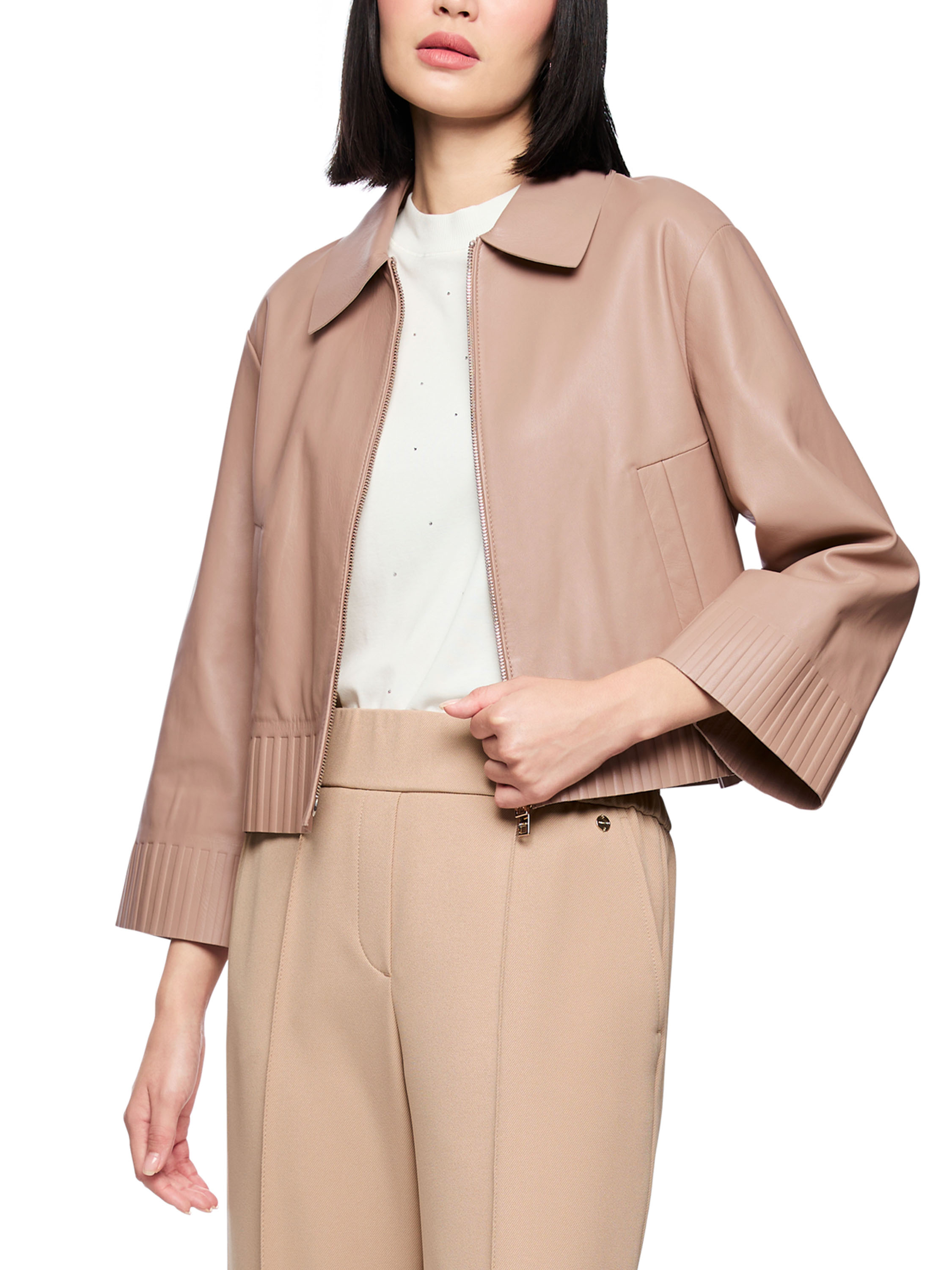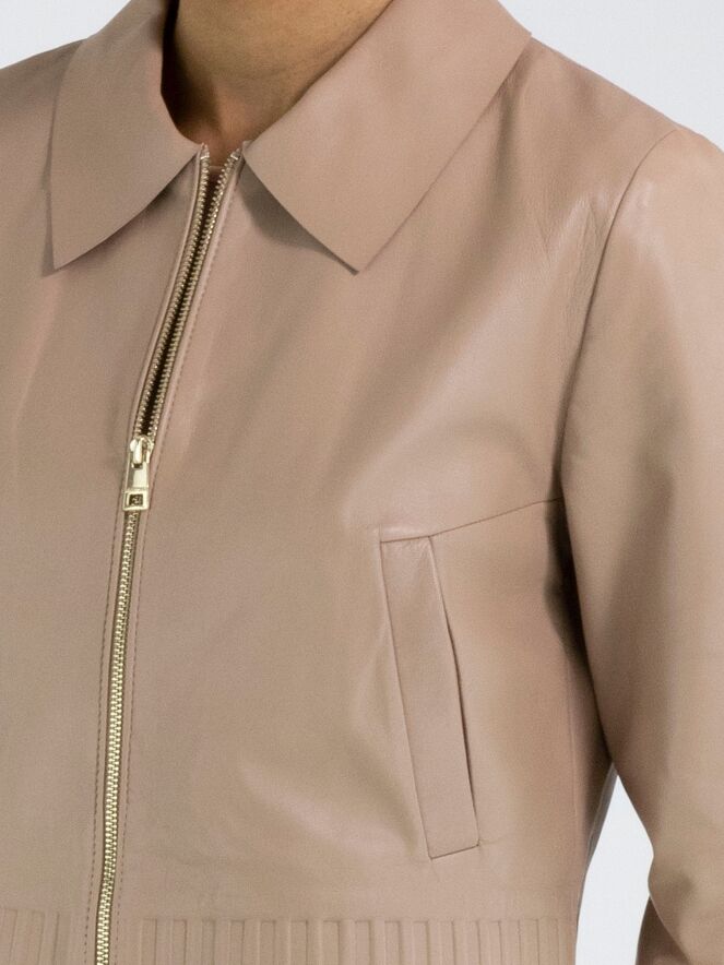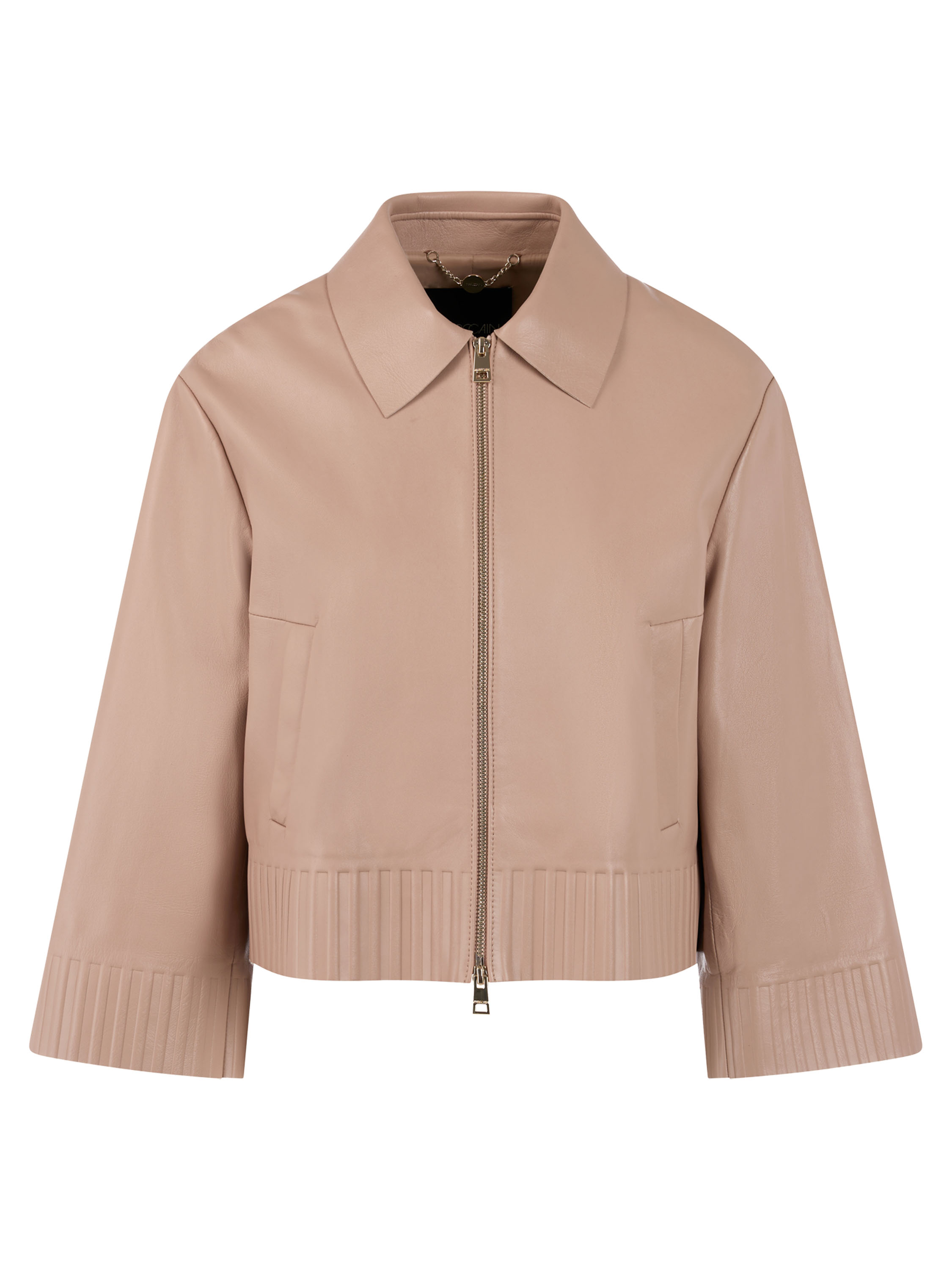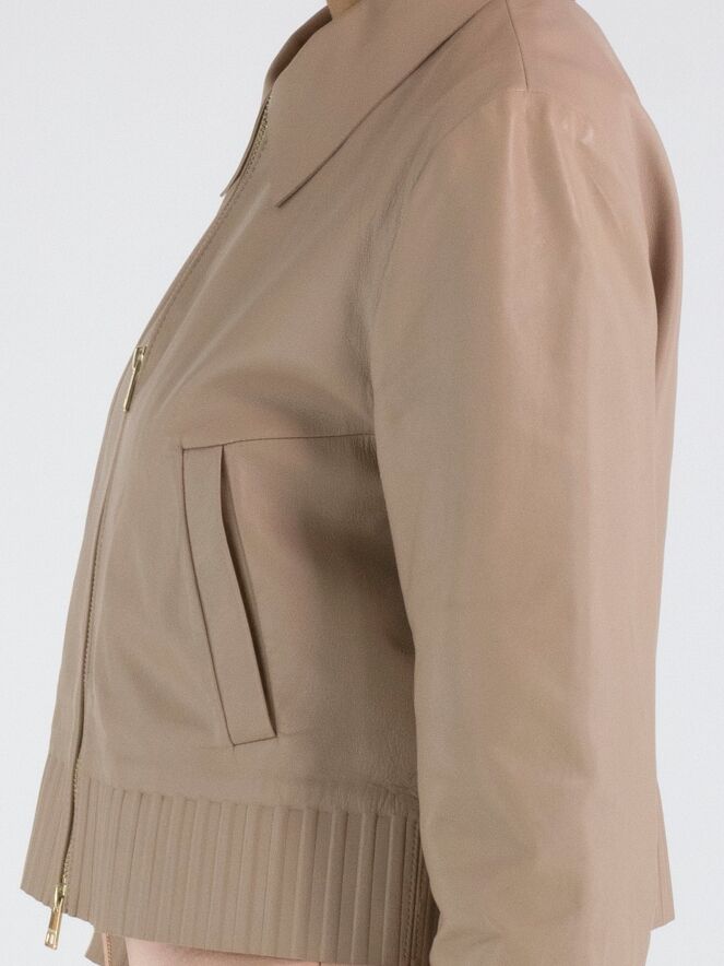 Een korte lederen coat van Marc Cain in een zachte taupe kleur. De coat heeft een kraag en een ritssluiting. Aan de onderkant en aan de uiteinden van de lange mouwen is een brede band waarin in het leder een ribbelpatroon is gestanst. Deze coat mag niet worden gewassen.