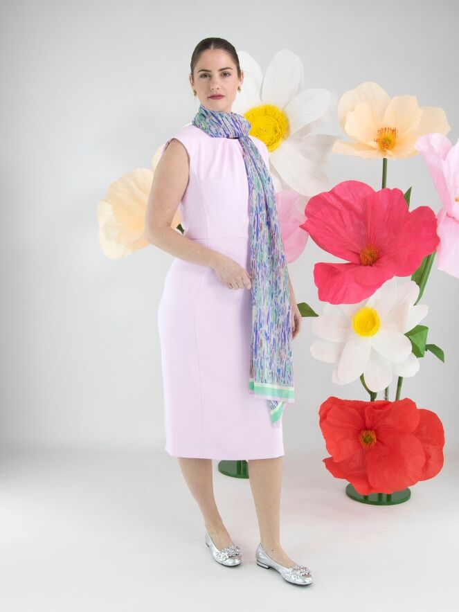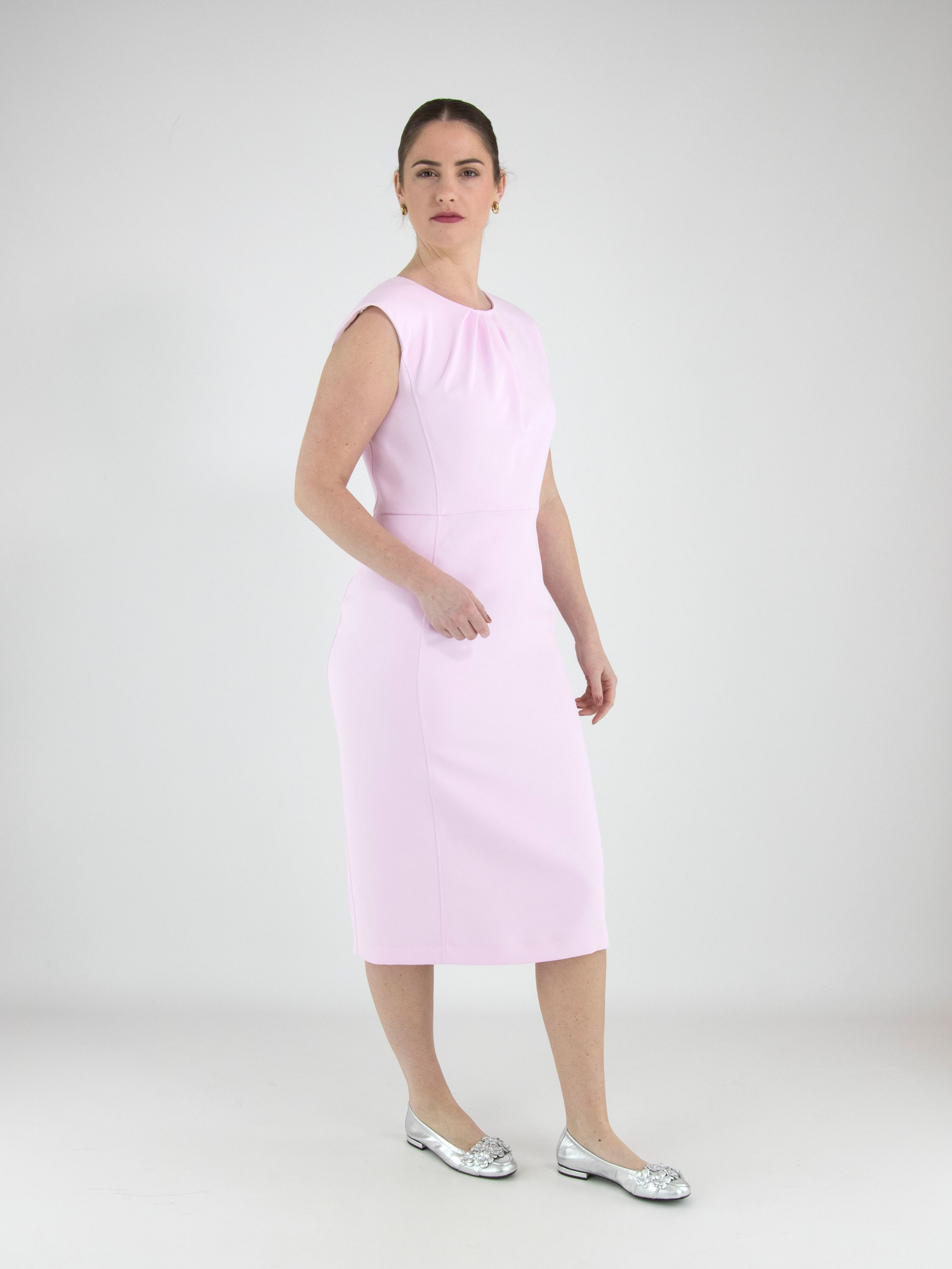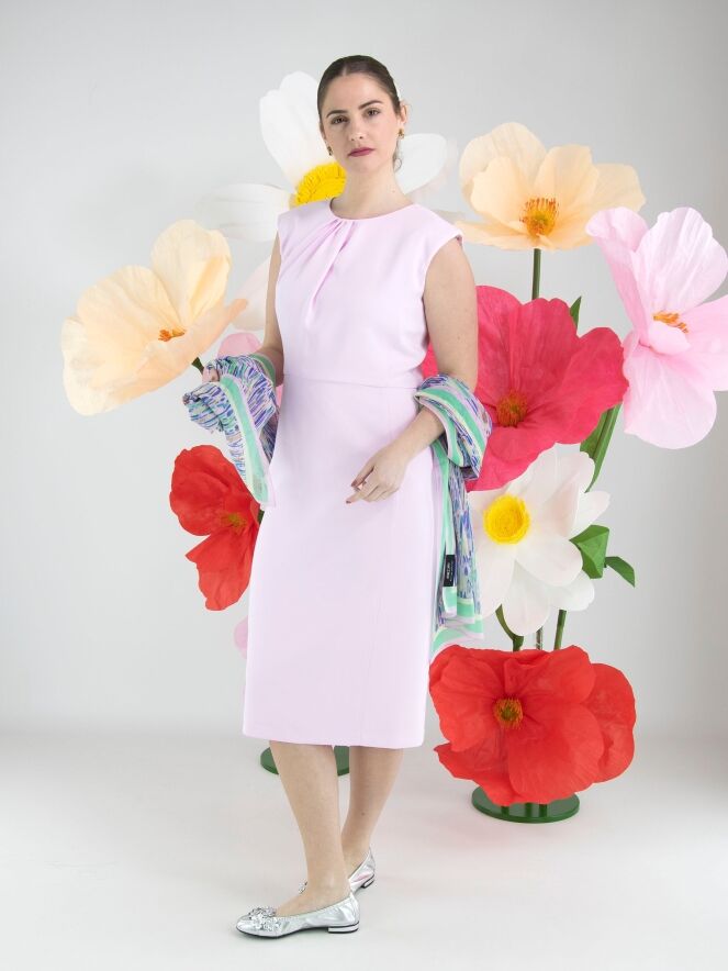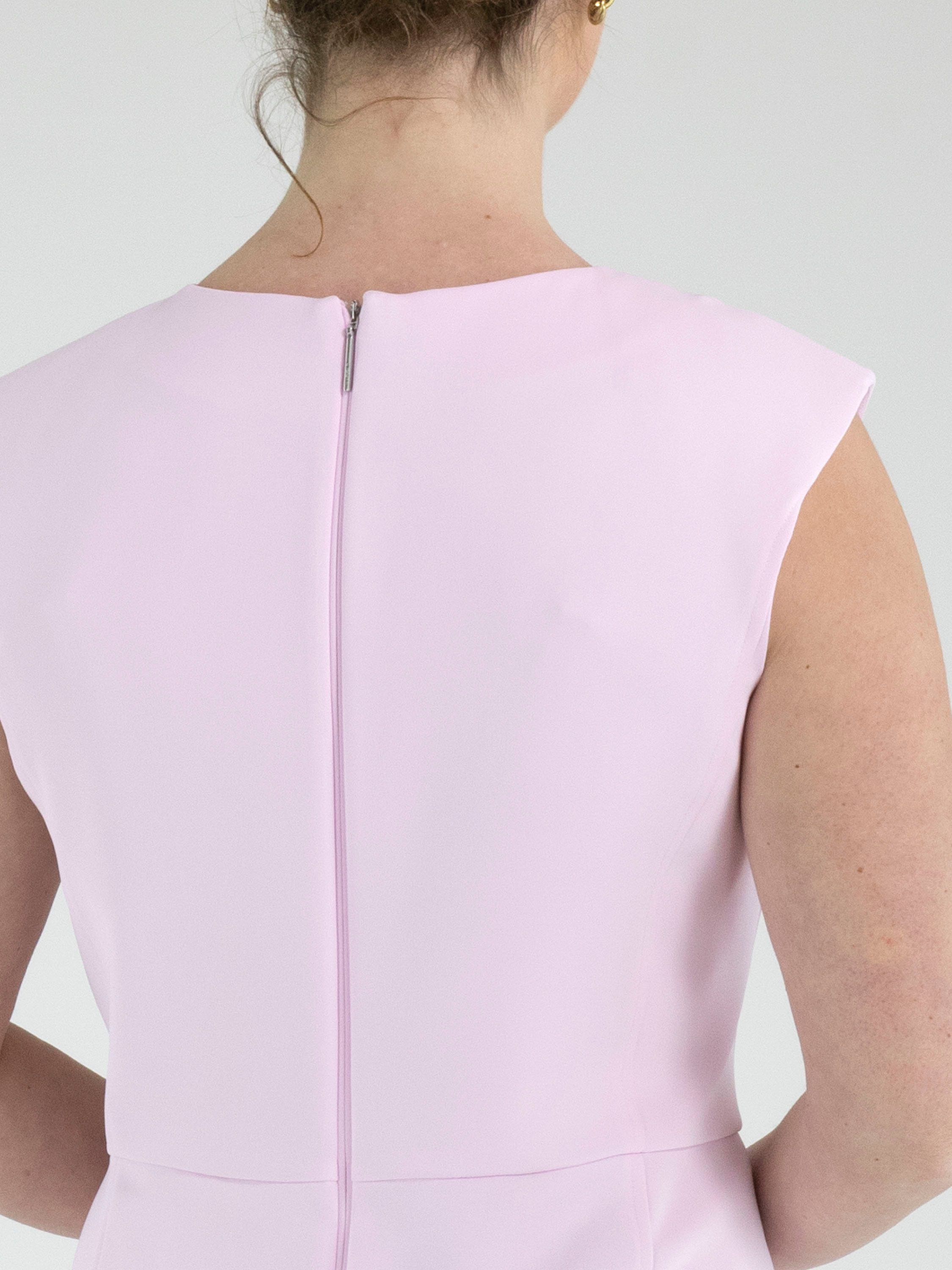 Een jurk van Marc Cain in een heldere roze kleur. In het midden van de ronde hals zijn vier plissés verwerkt, waardoor een diagonaal plooieffect ontstaat. Aan de achterzijde loopt een ritssluiting vanaf de hals tot aan de heupen. De jurk is gevoerd en kan op 30 graden worden gewassen.