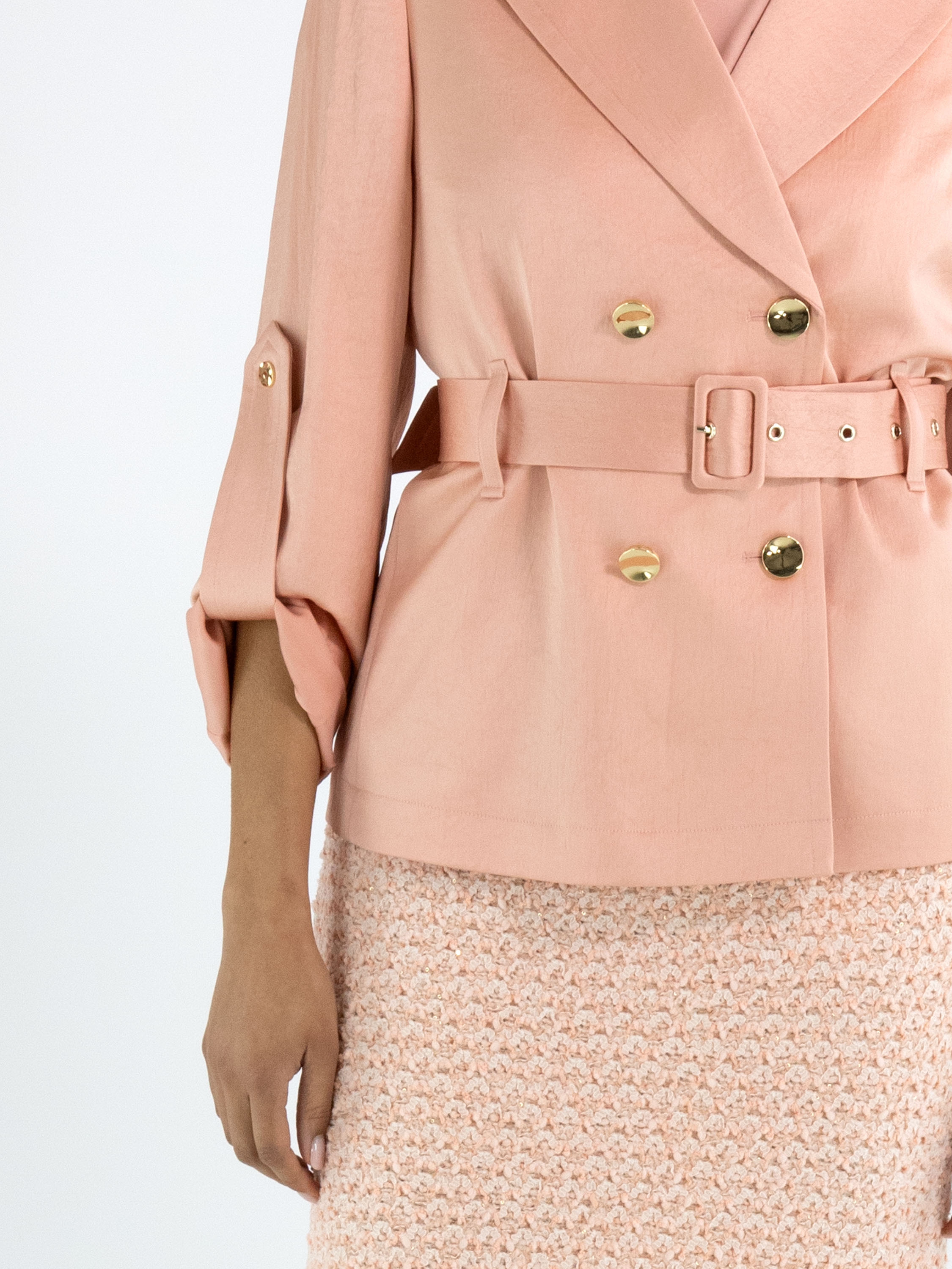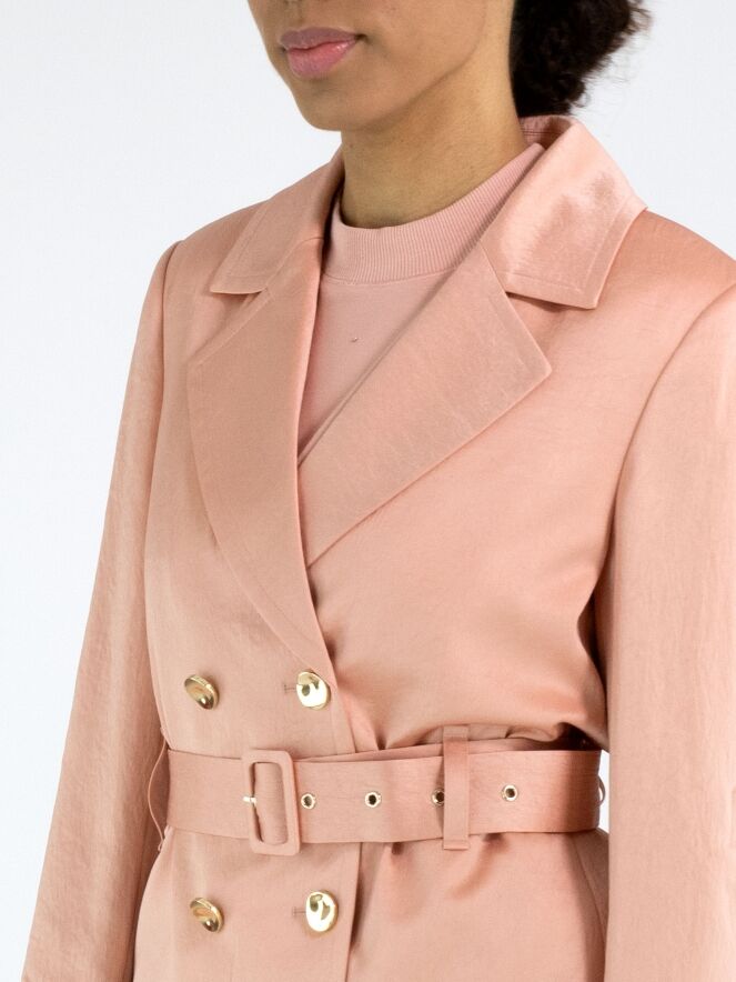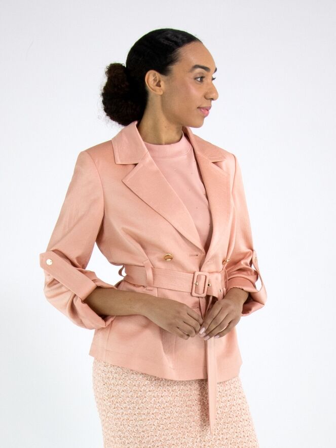 Een double breasted blazer van Marc Cain in een mat satijnen stof in de kleur zalmroze. De blazer heeft decoratieve goudkleurige knopen. Ter hoogte van de taille is een ceintuur in dezelfde stof als de blazer. In de mouwen is een gesp waarmee omgeslagen mouwen kunnen worden vastgezet met een drukknoop. De blazer is gevoerd en mag niet worden gewassen.
