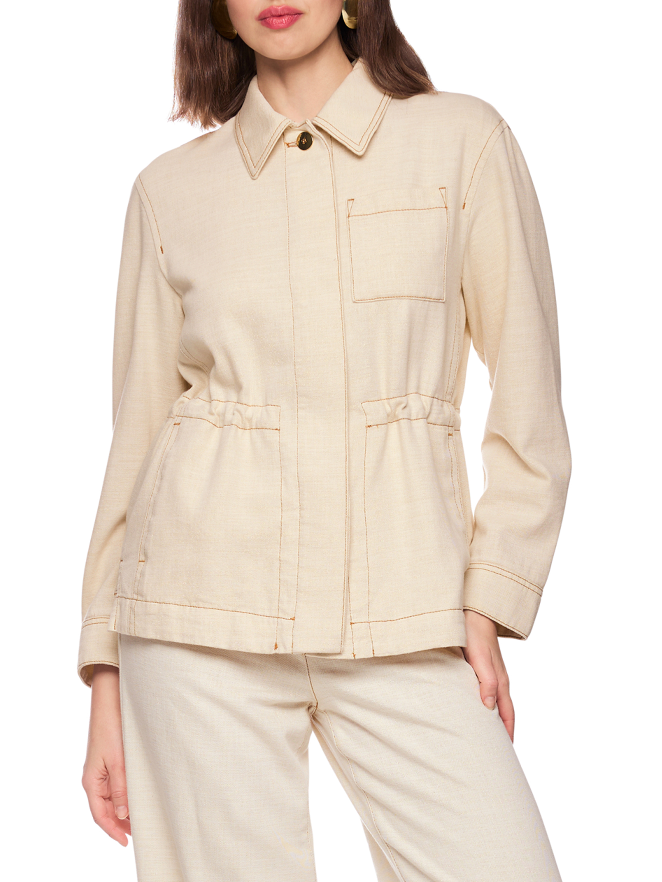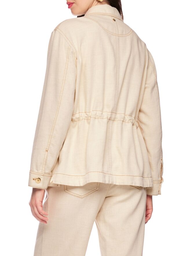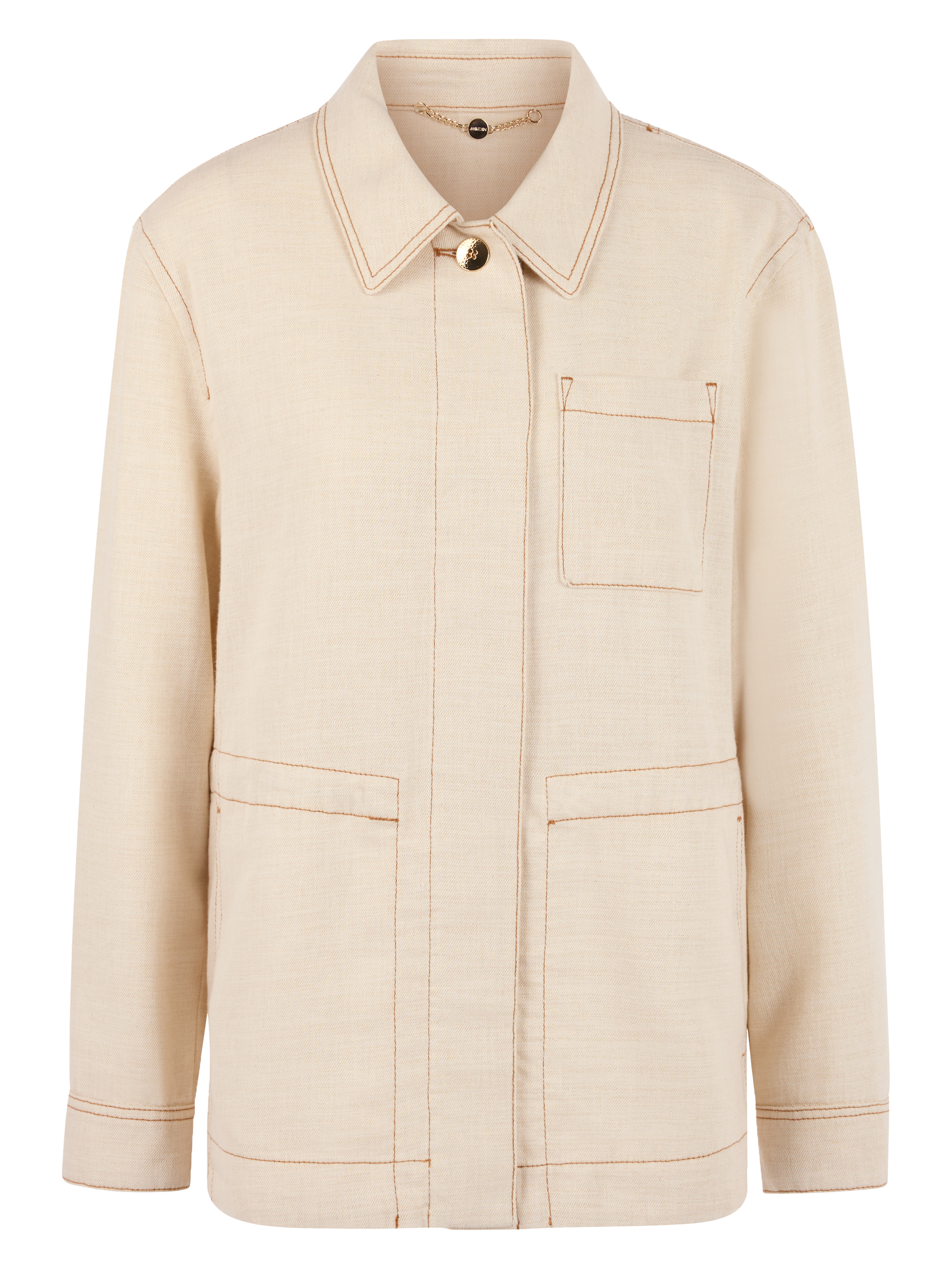 Blazer van Marc Cain in een safari-look in een beige tint, afgewerkt met cognacbruine stiknaden. De knoopsluiting is, op de bovenste knoop na, blind verwerkt, wat zorgt voor een rustige en verfijnde uitstraling. Ter hoogte van de taille is een koord in tunnelverwerking aangebracht dat aan de binnenzijde kan worden aangetrokken, waarmee de taille subtiel wordt geaccentueerd. Deze nonchalant vallende blazer kan op 30 graden worden gewassen.
