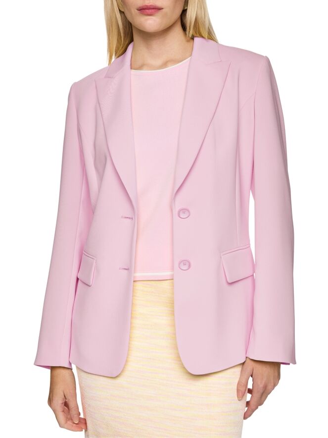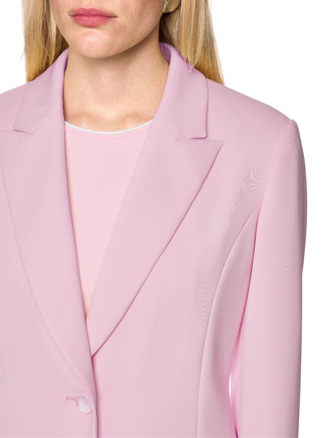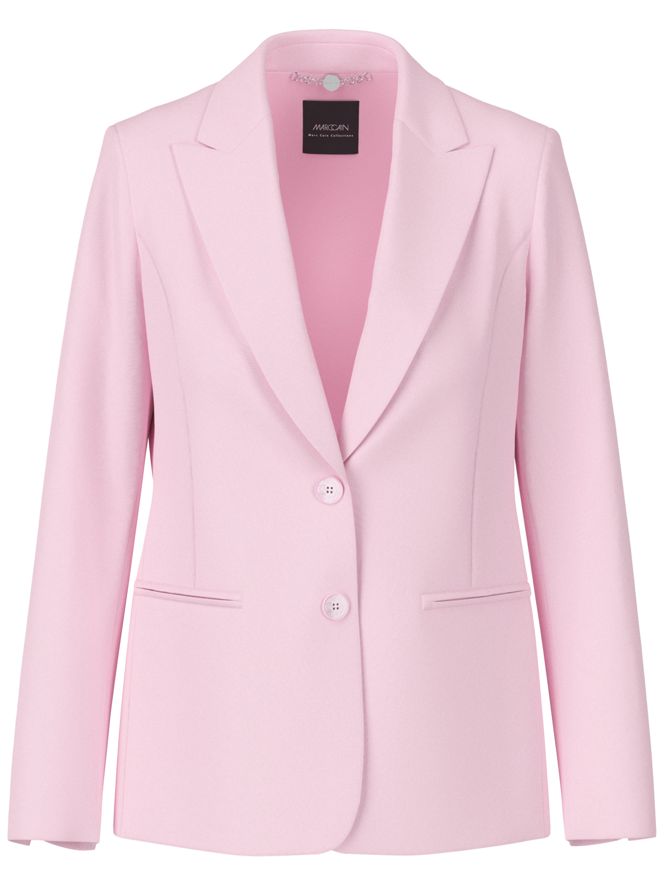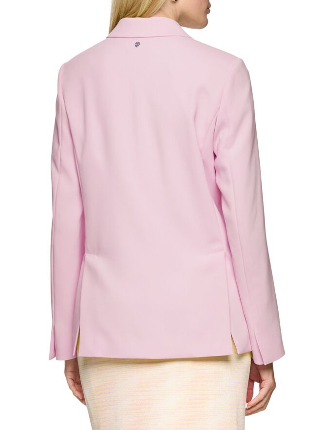 Een blazer van Marc Cain in een heldere roze kleur. De blazer heeft een sluiting met twee knopen. Aan de uiteinden van de lange mouwen zijn de manchetten voorzien van een korte split. Aan de achterzijde bevinden zich aan de onderkant, aan weerszijden van het midden, twee splitten. Deze blazer mag niet worden gewassen.