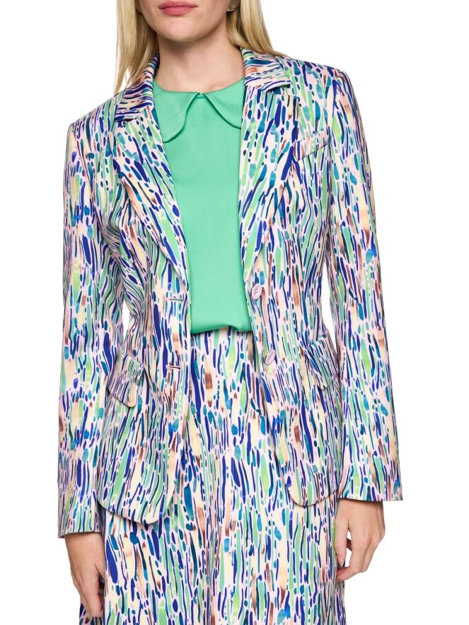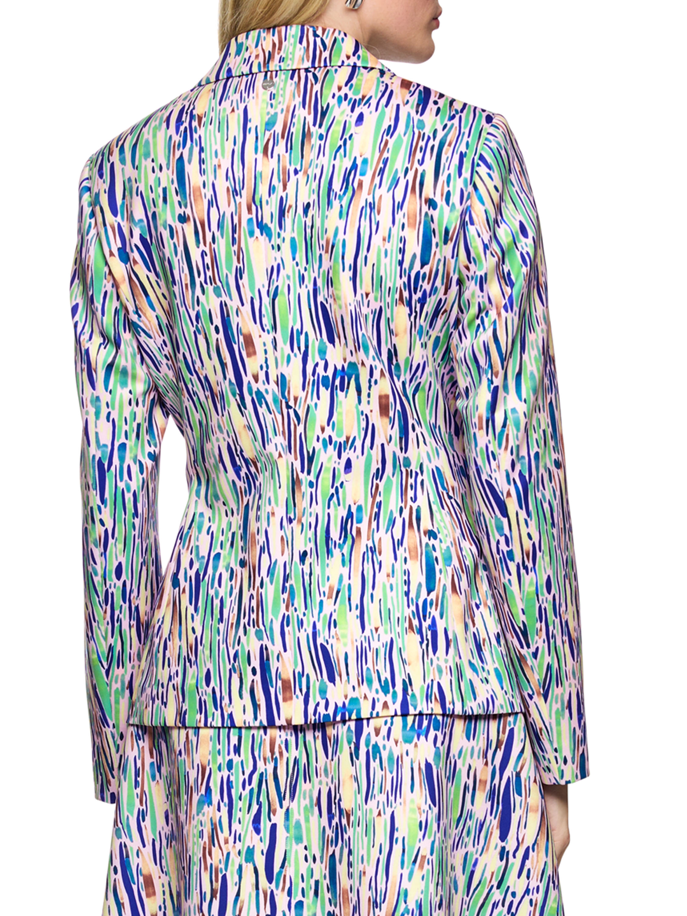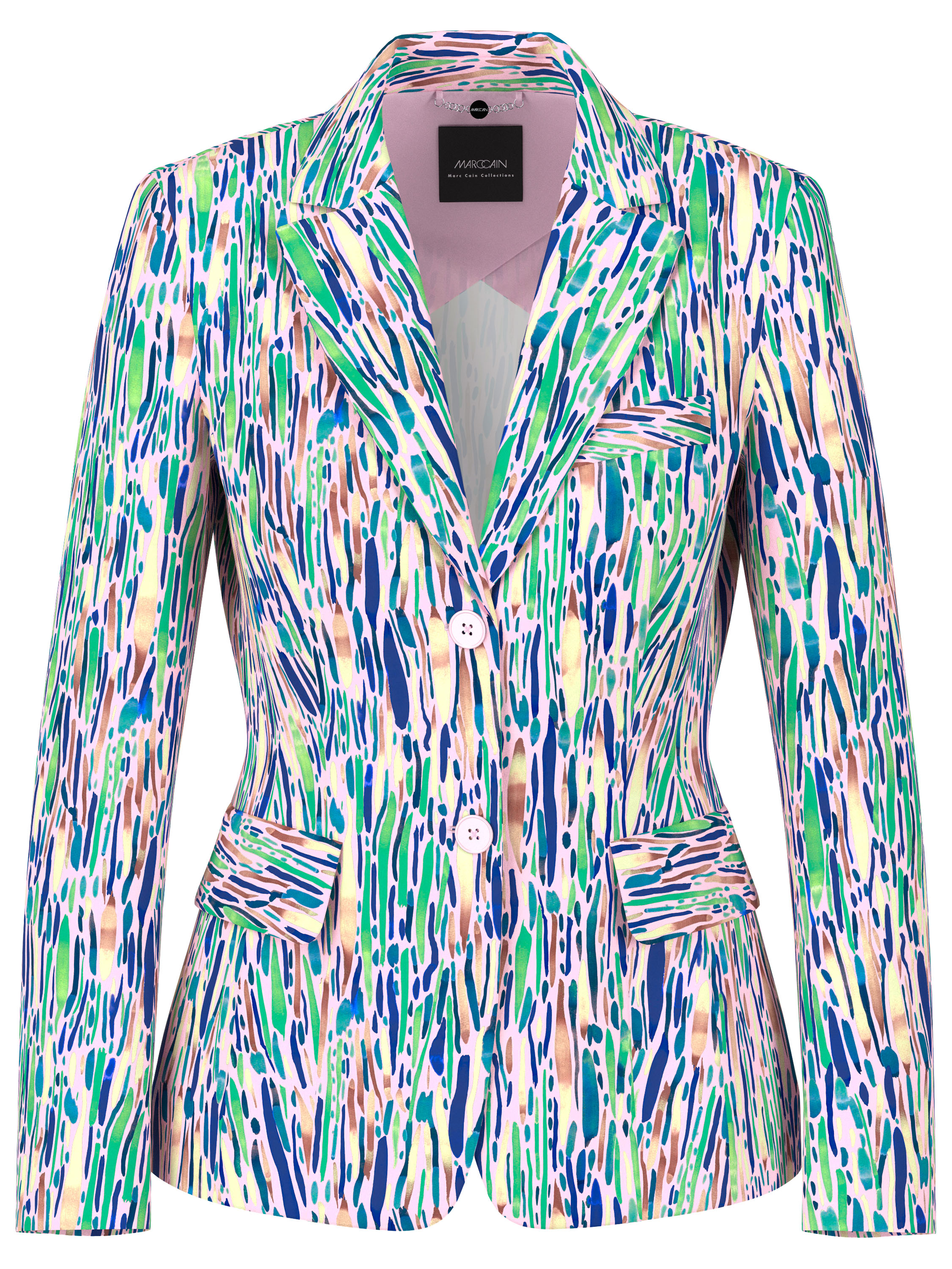 Een blazer van Marc Cain met een confettiprint in meerdere tinten groen, blauw en bruin op een pastelroze achtergrond. De sluiting is uitgevoerd met twee knopen van roze emaille. Deze blazer kan op 30 graden worden gewassen.